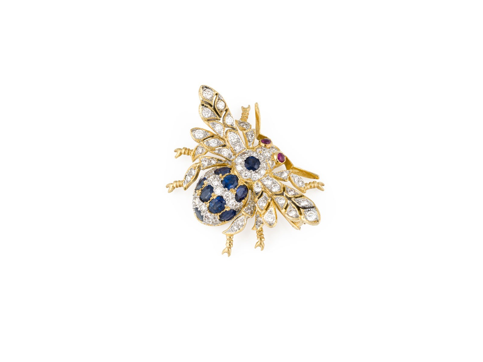 GG 750. Maße: ca. 32,0 x 21,5 mm. Ges.-Gew.: ca. 6,1 g. Brosche in Form eines Insekts, besetzt mit Diamanten zus. ca. 0.65 ct., sowie Saphiren