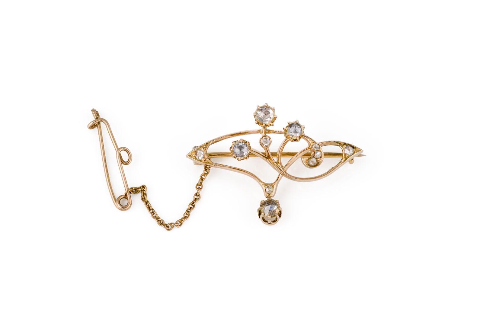 RG 585/333 (getestet). Maße: ca. 35,8 x 25,3 mm. Ges.-Gew.: ca. 5,2 g. Brosche, besetzt mit Diamanten im Rosenschliff zus. ca. 0.50 ct. Inkl. Sicherheitskette