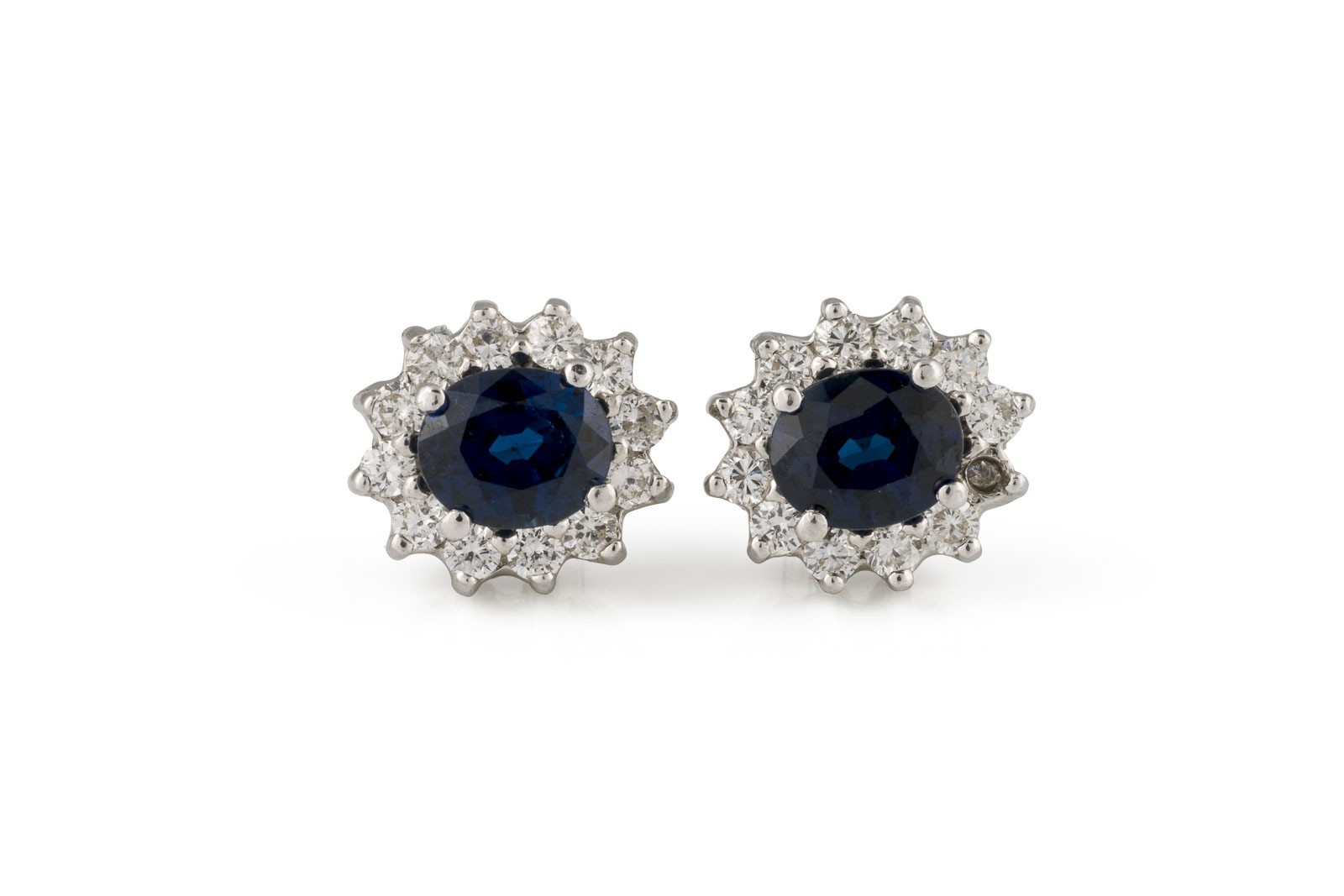WG 585. Maße: ca. 9,3 x 8,6 mm. Ges.-Gew.: ca. 2,5 g. Ohrstecker, besetzt mit je einem zentralen Saphir von ca. 0.50 ct., sowie je einem Kranz