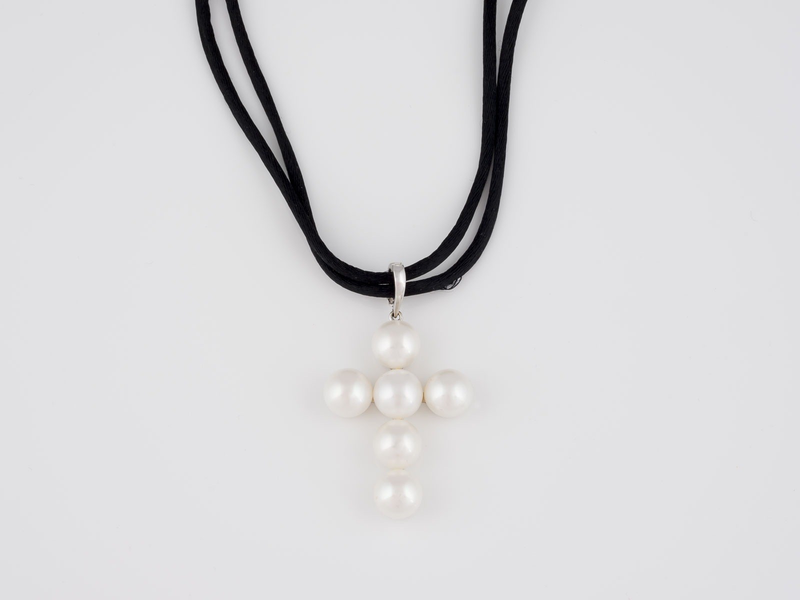 WG 750. Ges.-Gew.: ca. 13,8 g. Kreuzanhänger aus Perlen an Satinband. Maße(Anhänger): L: ca. 52,3 mm (inkl.Öse), B.: ca.