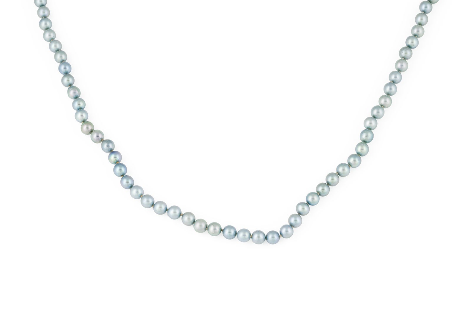 WG 585. Maße: L.: ca. 90,0 cm. Ges.-Gew.: ca. 47,4 g. Langes Perlencollier. D.(Perle): ca. 6,2 mm