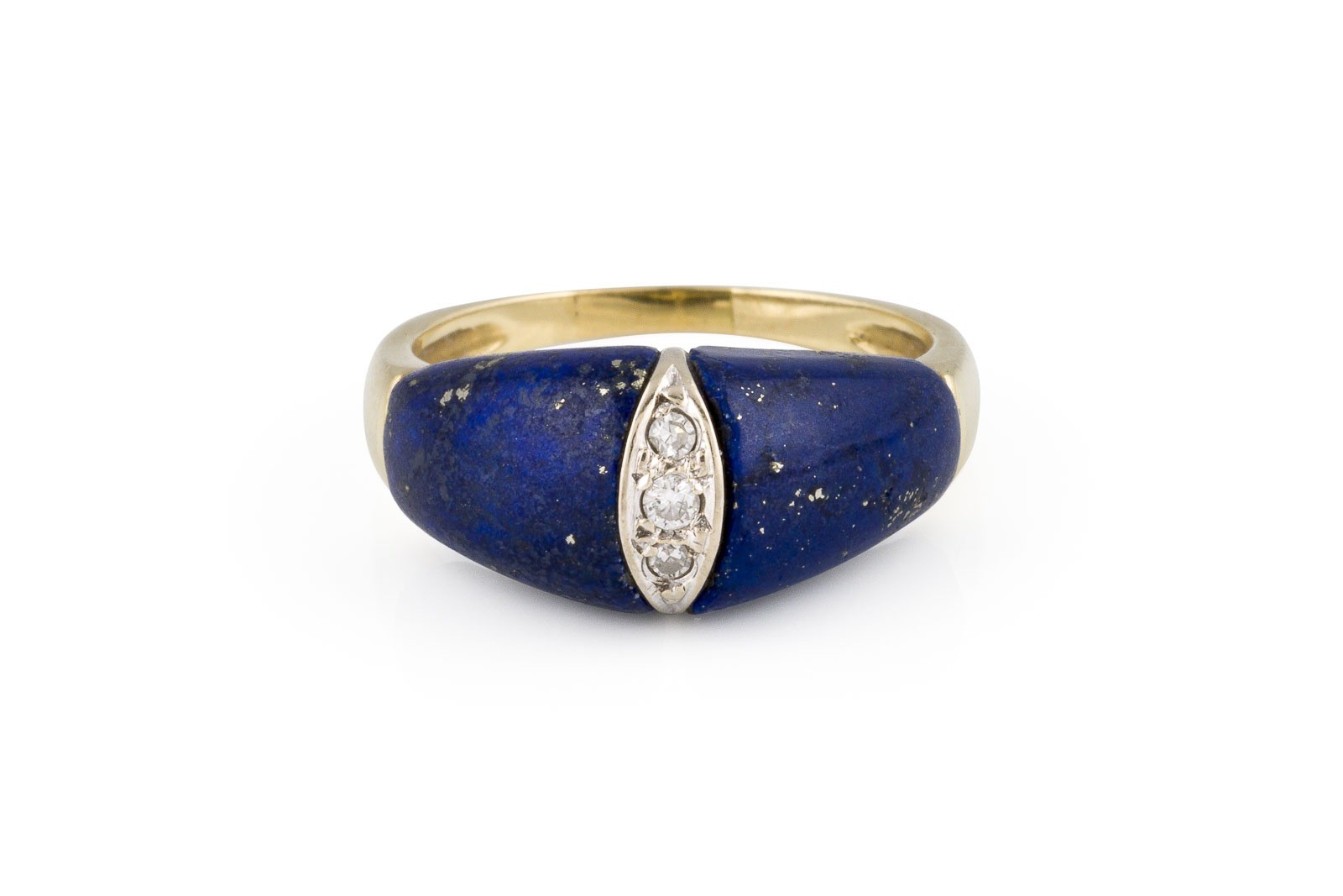 WG/GG 585 (getestet). Ringmaß: ca. 58. Ringbreite: ca. 9,6 mm. Ges.-Gew.: ca. 5,0 g. Ring, besetzt mit Elementen aus Lapislazuli und Diamanten zus. ca. 0.05 ct.