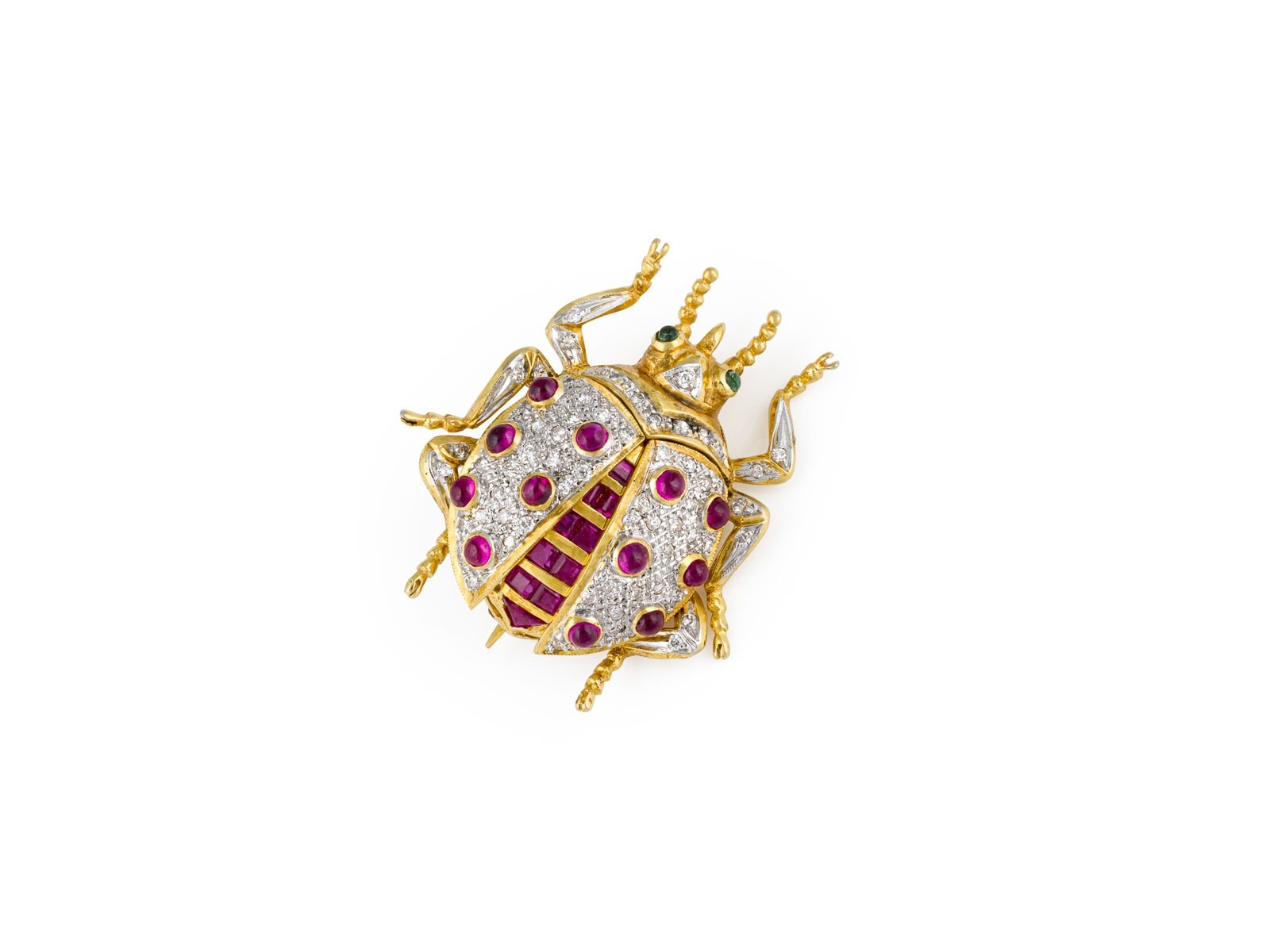 GG 750. Maße: ca. 29,7 x 27,2 mm. Ges.-Gew.: ca. 9,3 g. Brosch ein Form eines Marienkäfers, besetzt mit Diamanten zus. ca. 0.30 ct., wohl Rubinen