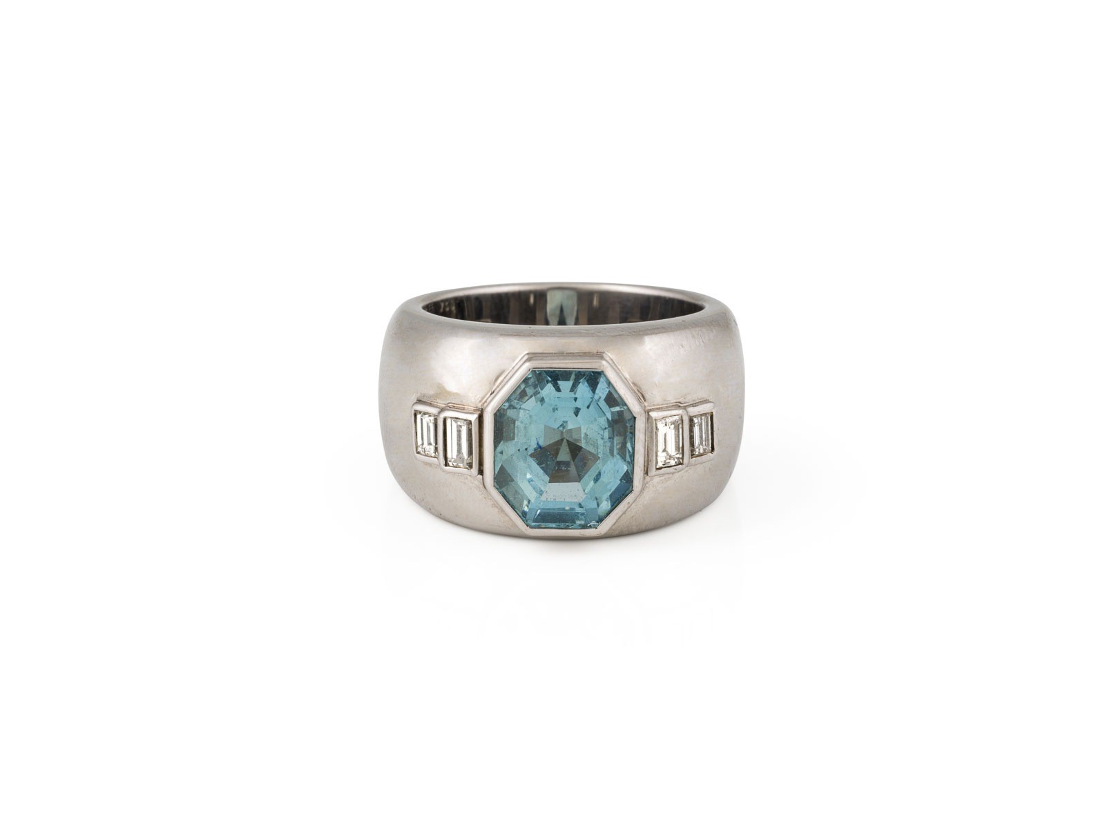 WG 750. Ringmaß: ca. 62. Ringbreite: ca. 15,0 mm. Ges.-Gew.: ca. 23,5 g. Massiver Ring, besetzt mit einem Aquamarin von ca. 5.15 ct., sowie 4 Diamanten im
