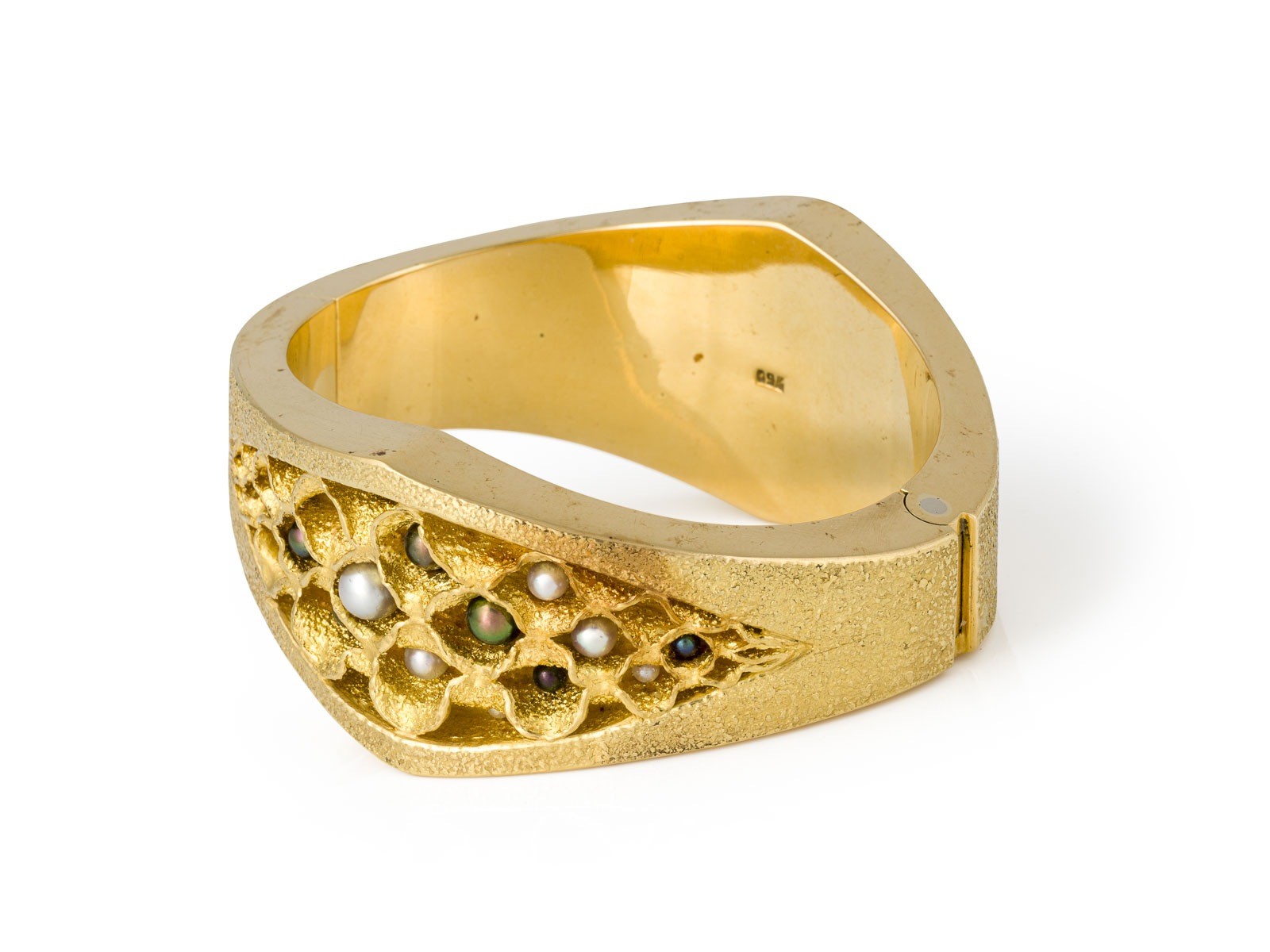 GG 750. Maße: D.(innen): ca. 60,0 mm. Breite: ca. 29,1 mm.. Ges.-Gew.: ca. 118,0 g. Massiver Armreif, besetzt mit Perlen. Mattierte Oberfläche. Steckverschluss mit