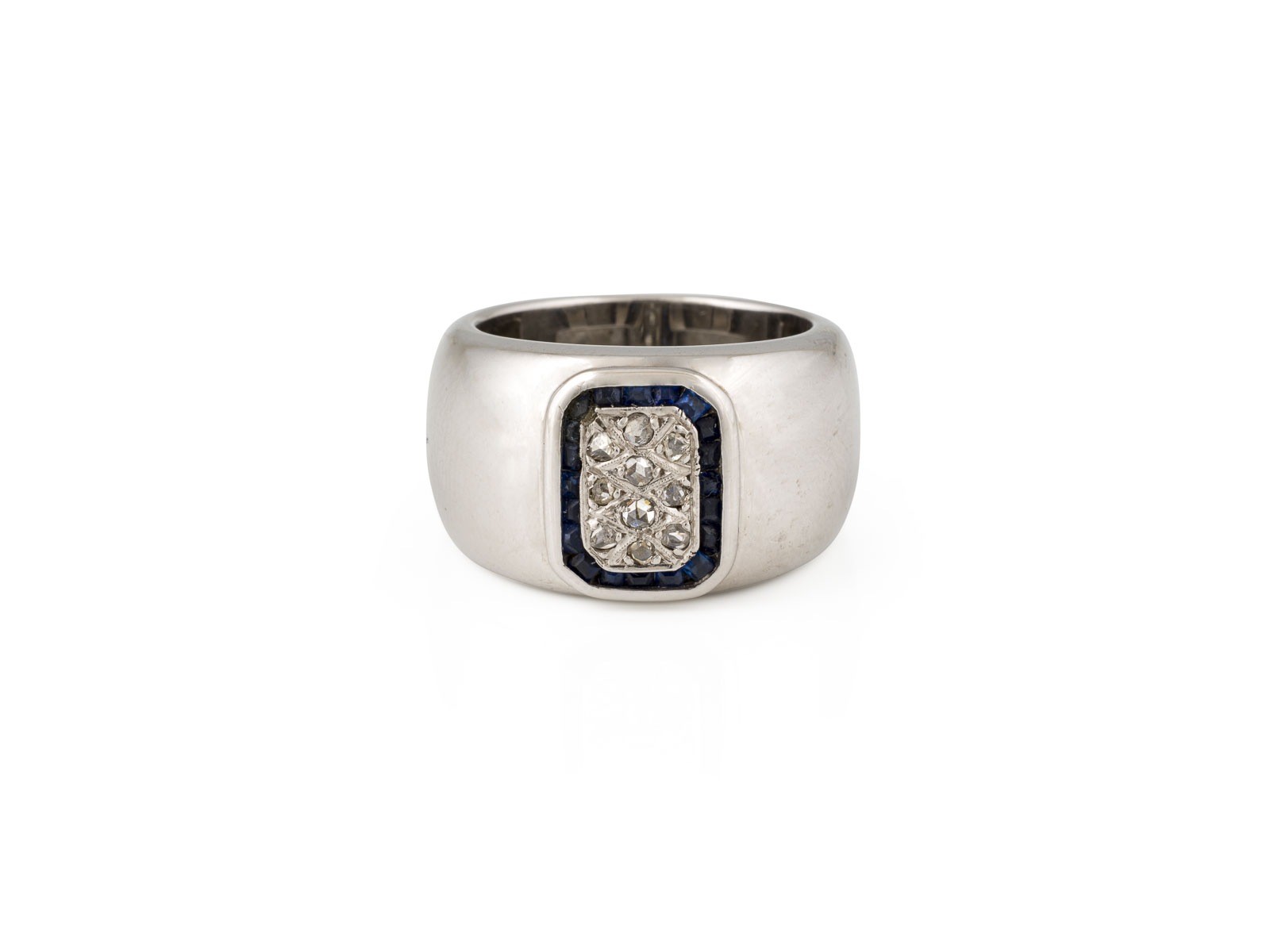 WG 750. Ringmaß: ca. 62. Ringbreite: ca. 15,1 mm. Ges.-Gew.: ca. 21,7 g. Massiver Ring, besetzt mit 10 Rosendiamanten und einem Kranz aus Saphiren.