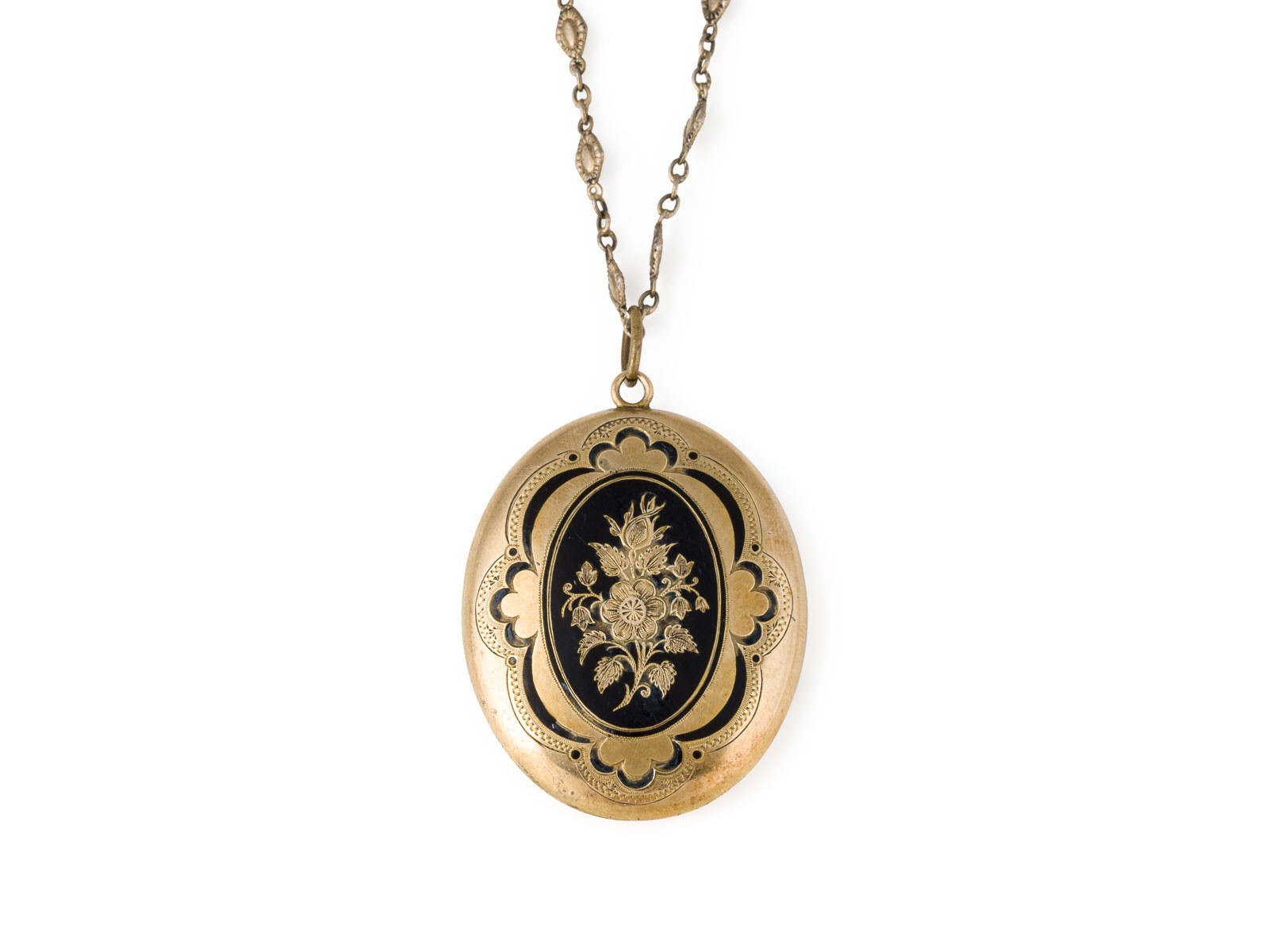 GG 333/585 (getestet). L.(Collier): ca. 60,0 cm. Ges.-Gew.: ca. 13,6 g. Medaillon mit schwarzer Emaille und Blumen-Ornamenten auf der Frontseite. teilw. best. und ber.