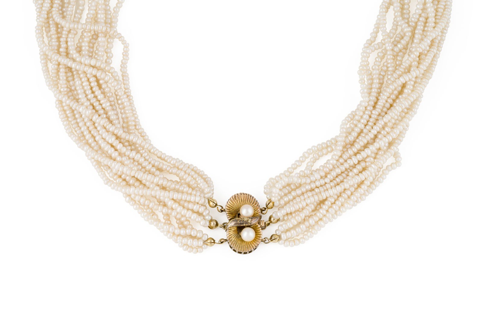 GG 585. Maße: L.: ca. 52,0 cm. D.(Perle): ca. 2,5-3,5 mm. Ges.-Gew.: ca. 102,0 g. 15-strängiges Perlencollier.