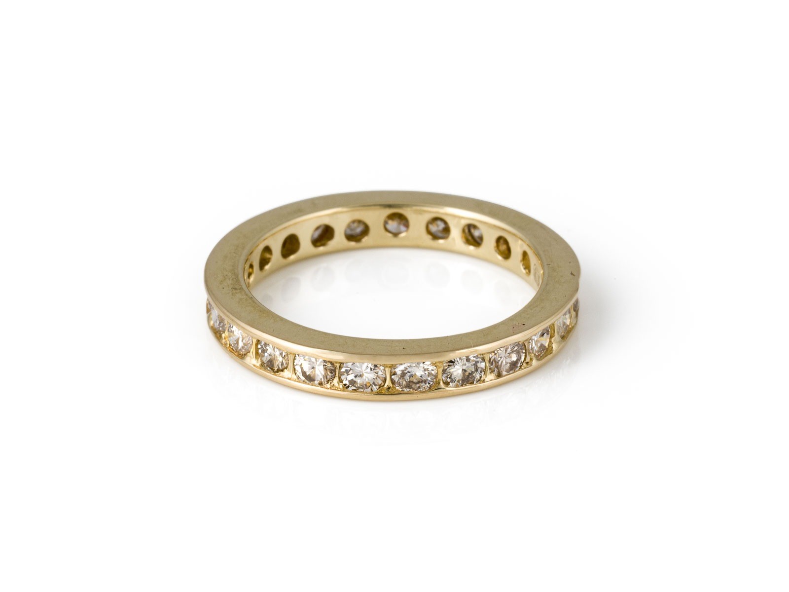 GG 585. Ringmaß: ca. 53. Ringbreite: ca. 3,0 mm. Ges.-Gew.: ca. 3,2 g. Memoire Ring, besetzt mit Brillanten zus. ca. 1.00 ct.