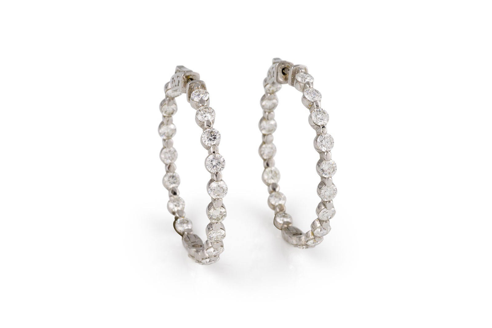 WG 585. D.(außen): ca. 37,0 mm. Ges.-Gew.: ca. 11,4 g. Creolen, besetzt mit Brillanten zus. ca. 5.00 ct. G-H/SI-P.