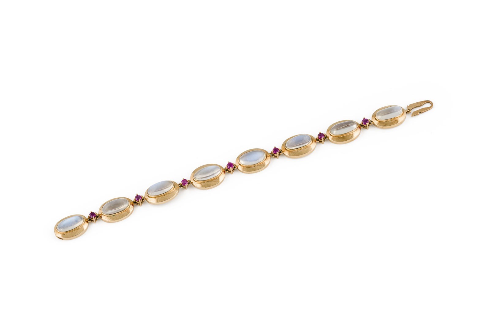 GG 585. L.: ca. 19,0 cm. B.: ca. 13,3 mm. Ges.-Gew.: ca. 20,5 g. Armband, besetzt mit Mondstein-Cabochons zus. ca. 24.00 ct., sowie wohl pinke Saphire zus.