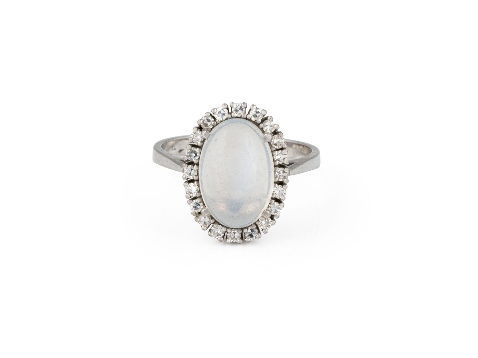 WG 750 (getestet). Ringmaß: ca. 59,5. Ringkopfmaße: ca. 17,3 x 13,0 m. Ges.-Gew.: ca. 5,7 g. Ring, besetzt mit einem zentralen, großen Mondstein-Cabochon von ca. 4.80 ct., sowie einem