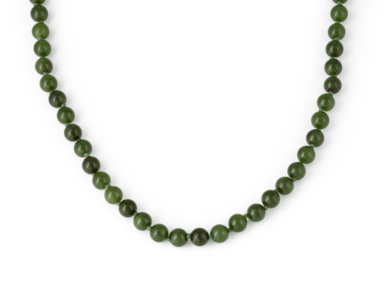 GG 750. L.: ca. 70,0 cm. Ges.-Gew.: ca. 64,5 g. Collier aus Nephrit-Kugeln. D.(Kugel): ca. 8,3 mm.