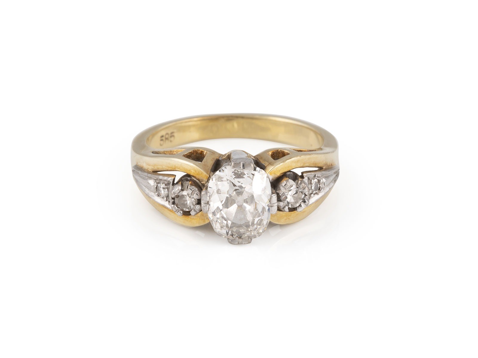 GG/WG 585. Ringmaß: ca. 50,5. Ges.-Gew.: ca. 5,3 g. Ring mit einem zentralen, oval facettierten Diamanten von ca. 0.90 ct. G/VS-SI , sowie