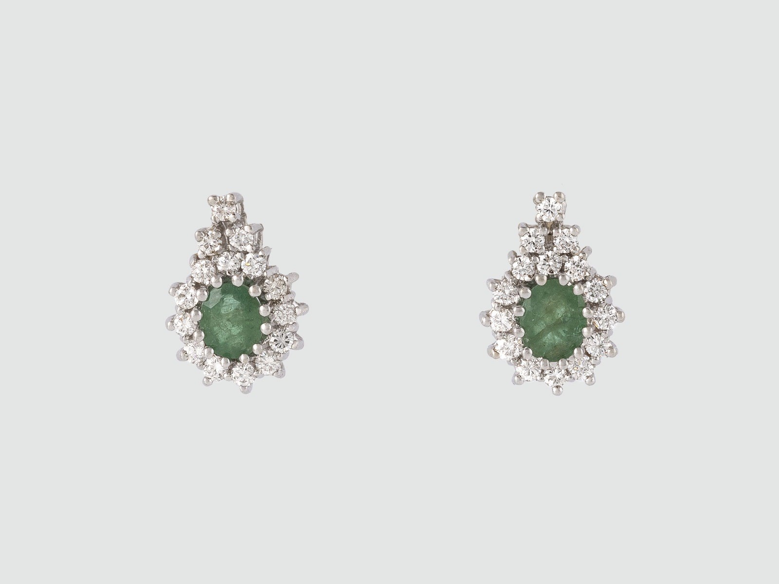Weißgold. L. 1,4 cm, Ges.-Gew. ca. 3,1 g. Geprüft 14 K. Jeweils ein oval facettierter Smaragd, zusammen ca. 0,80 ct., zusammen 30 Brillanten,