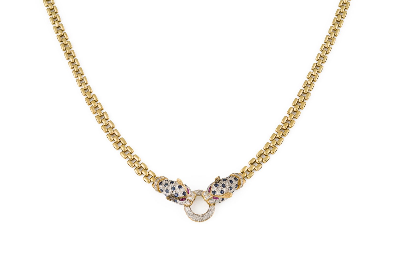 WG/GG 750. Maße: L.: ca. 45,0 cm. Ges.-Gew.: ca. 35,5 g. Collier mit zwei Pantherköpfen, besetzt mit Diamanten zus. ca. 0.50 ct, Saphiren zus ca.
