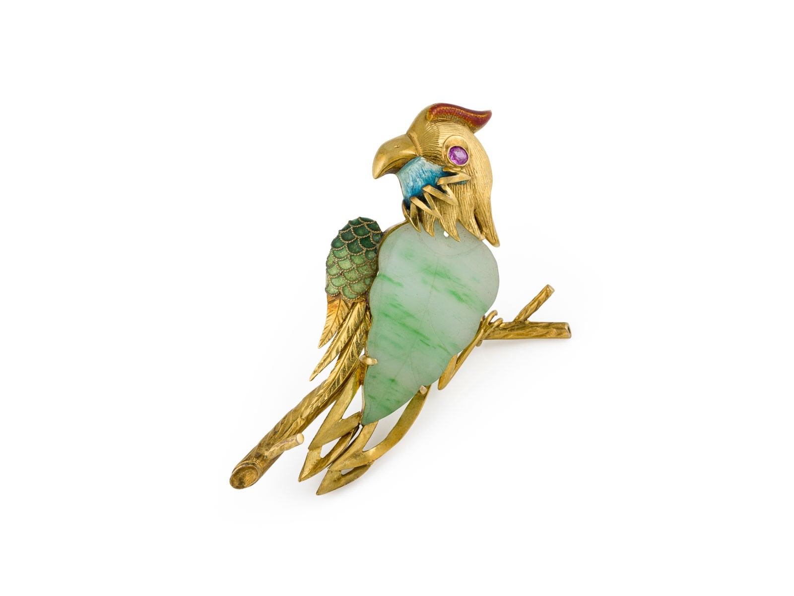 GG 585. Maße: ca. 59,0 x 34,0 mm. Ges.-Gew.: ca. 10,1 g. Emaillierte Brosche in Form eines Papageis mit einem pinken Farbstein als Auge und