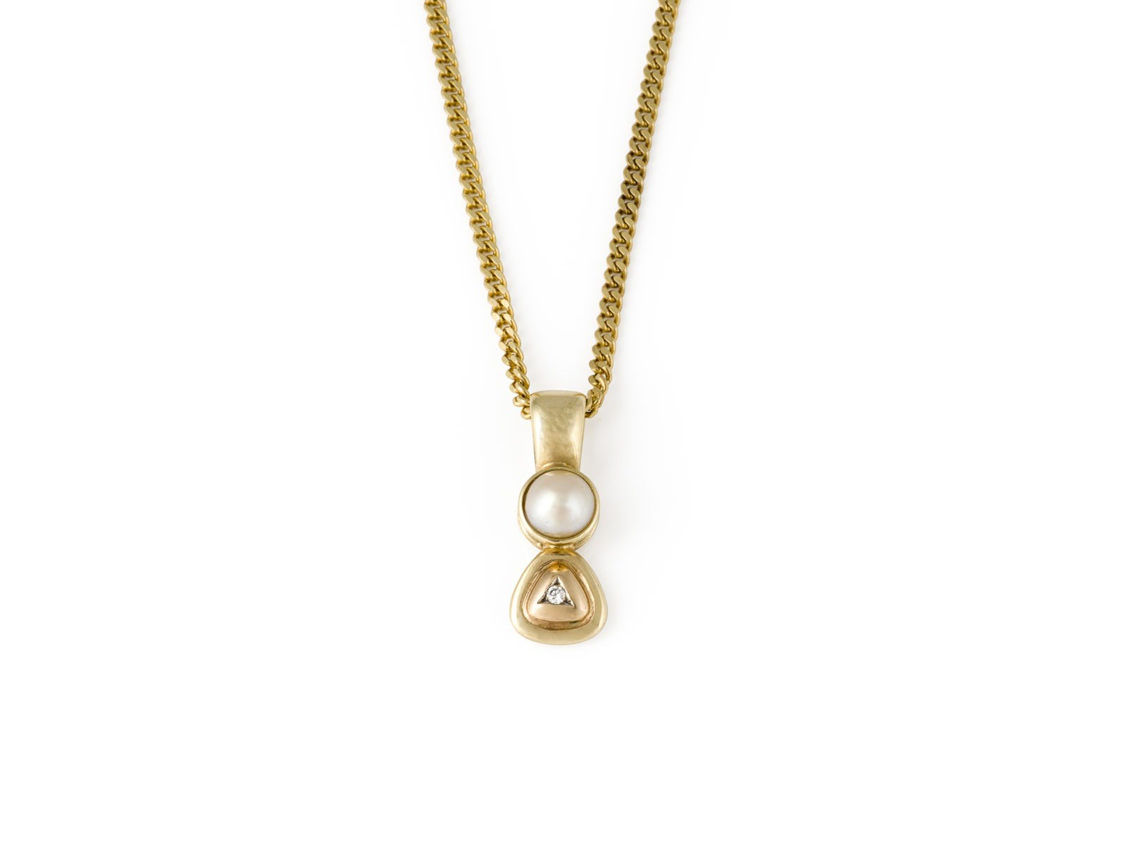 GG 585. L.(Collier): ca. 54,0 cm. Ges.-Gew.: ca. 11,3 g. Anhänger, besetzt mit einer Perle D.(Perle): ca. 6,0 mm, sowie einem Brillaten von ca.