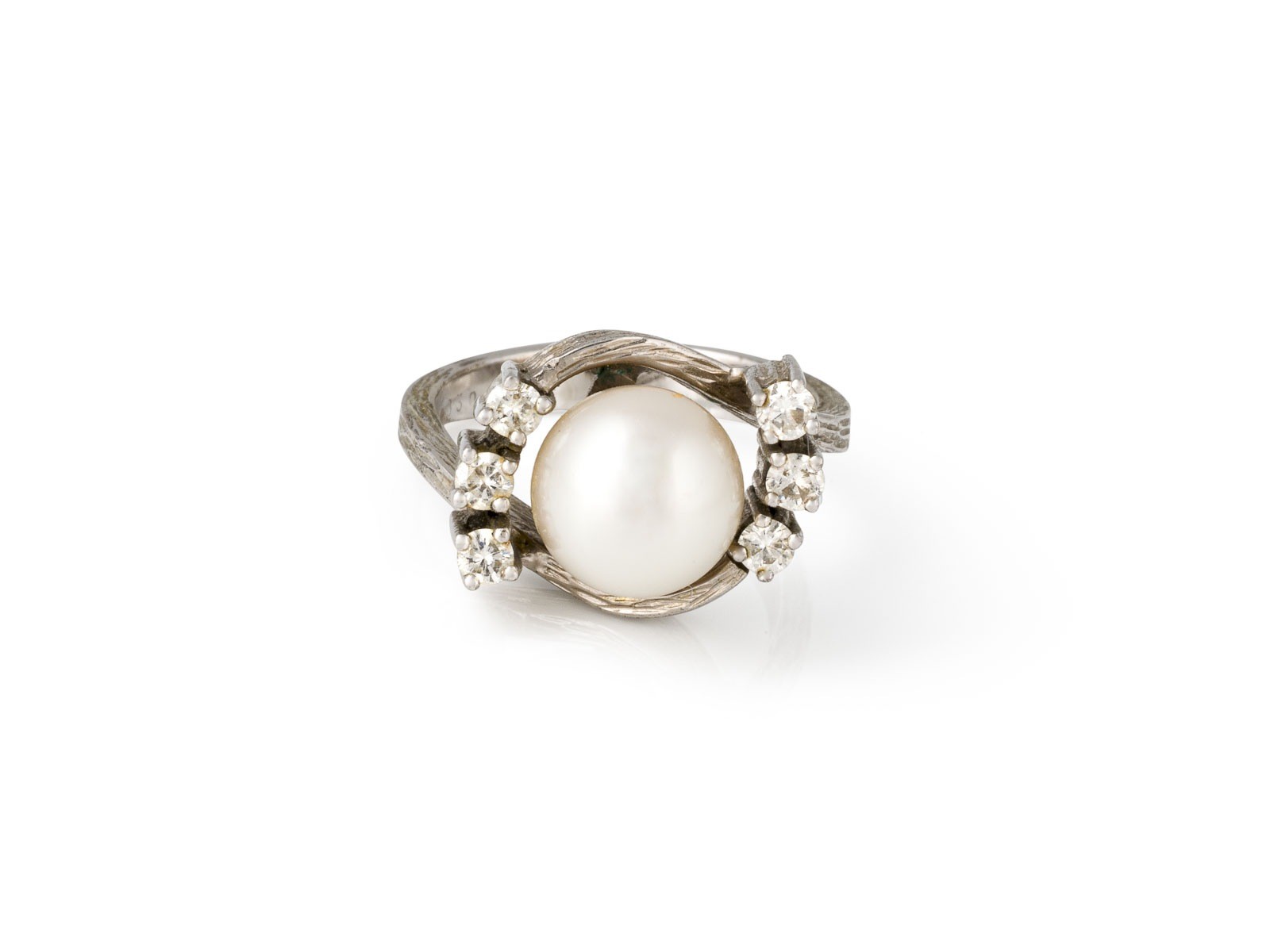 WG 585. Ringmaß: ca. 50. Ringkopfmaße: ca. 15,6 mm x 12,3. Ges.-Gew.: ca. 5,9 g. Ring, besetzt mit einer zentralen Perle D.(Perle): ca. 8,8 mm, sowie 6 Brillanten zus. ca.