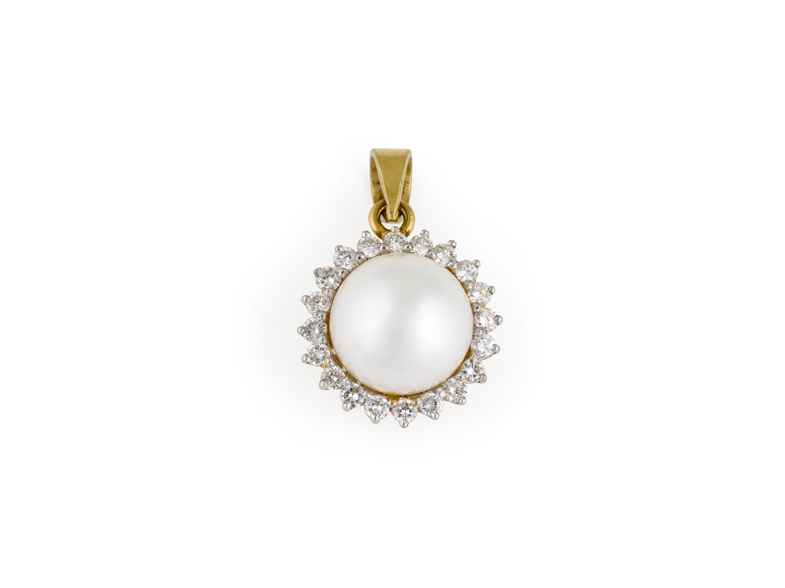 GG 750. Maße: ca. 24,0 x 15,8 mm. Ges.-Gew.: ca. 5,0 g. Anhänger, besetzt mit einer zentralen Perle, D.(Perle): ca. 11,0 mm, sowie einem Kranz aus