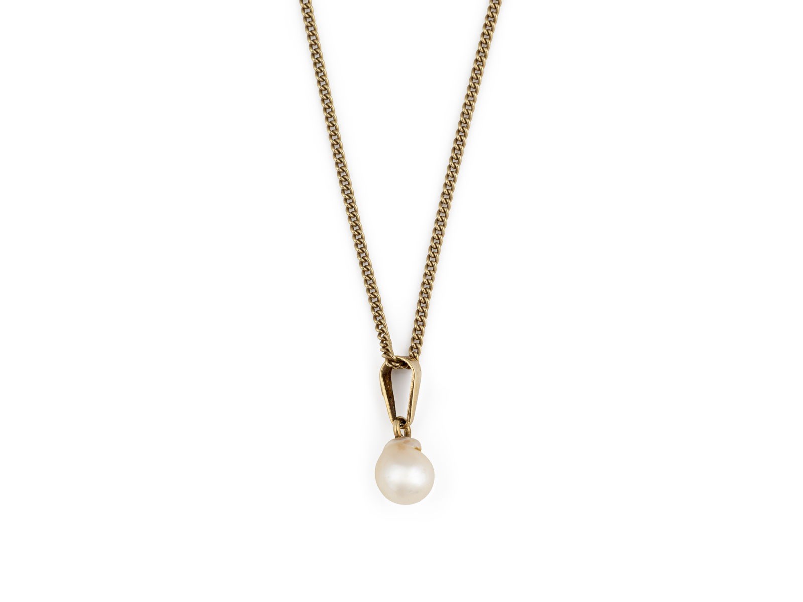 GG 585. L.(Collier): ca. 46,0 cm. Ges.-Gew.: ca. 3,1 g. Perlenanhänger an Collier. Maße(Anhänger): ca. 16,0 x 5,8 mm.