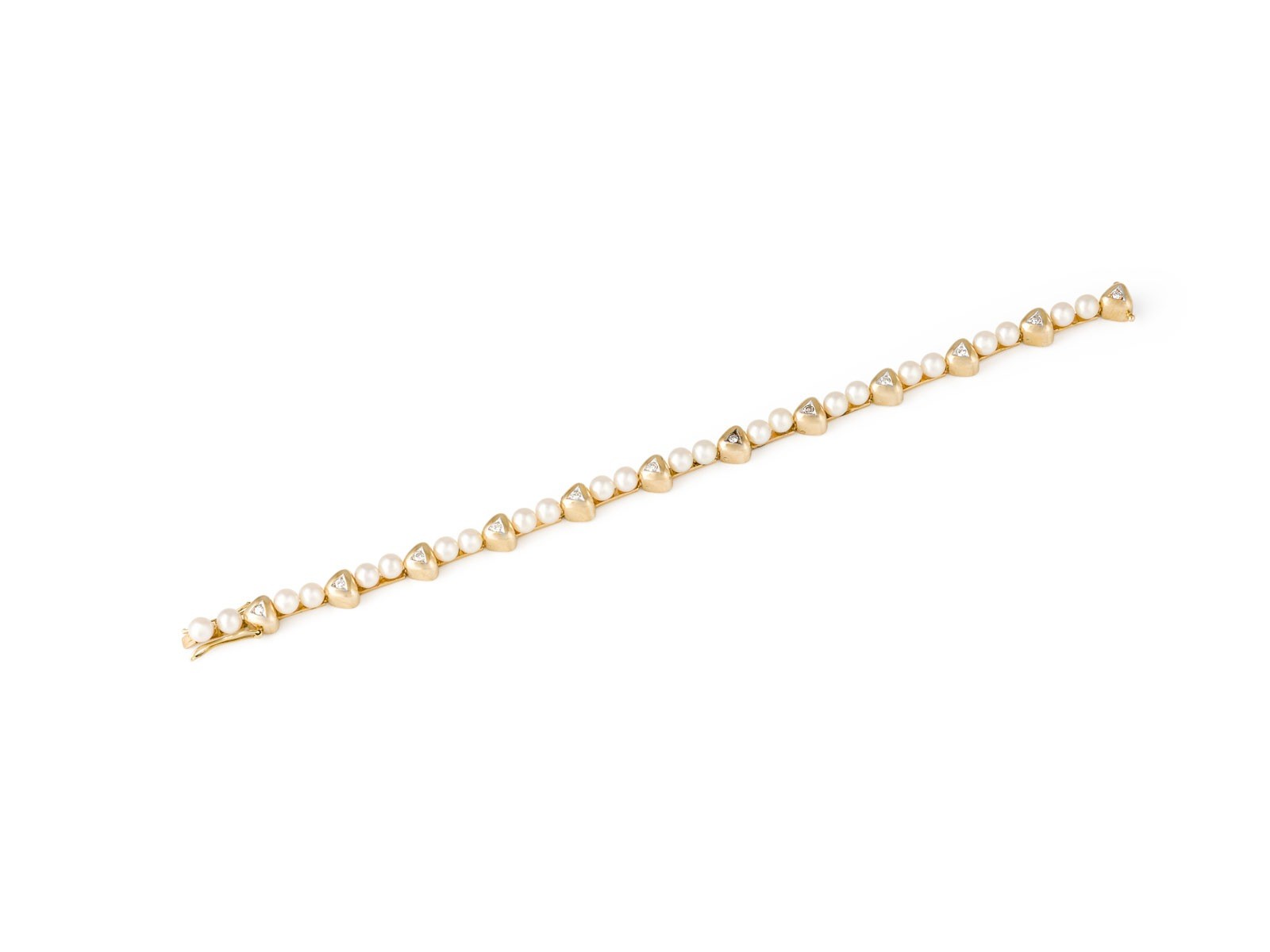GG 585. Maße: L.: ca. 16,5 cm. B.: ca. 5,8 mm. Ges.-Gew.: ca. 14,6 g. Armband, besetzt mit Perlen D.(Perle): ca. 4,2 mm, sowie Brillanten zus. ca. 0.12 ct.