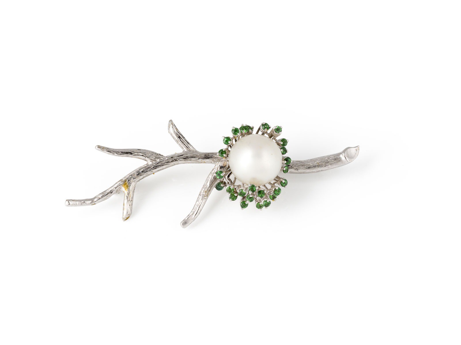 WG 750. Maße: ca. 66,0 mm x 24,3 mm. Ges.-Gew.: ca. 12,5 g. Brosche in Form eines Astes, besetzt mit einer Perle, D.(Perle): ca. 11,6 mm, sowie