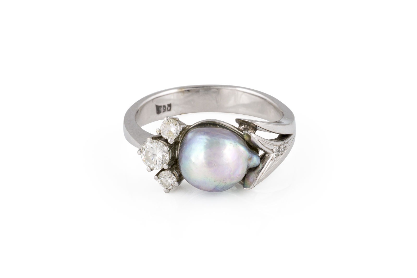 WG 585. Ringmaß: ca. 61. Ringkopfmaße: ca. 10,4 x 14,6 mm. Ges.-Gew.: ca. 6,9 g. Ring, besetzt mit Brillanten zus. ca. 0.40 ct. H-I/VVS-P, sowie einer Perle D.(Perle): ca.