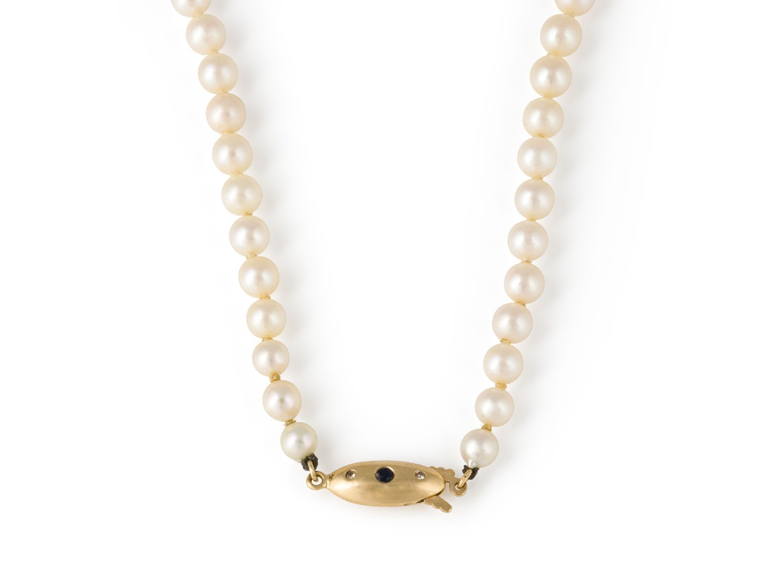GG 585. L.: ca. 59,0 cm. Ges.-Gew.: ca. 34,3 g. Collier aus größer werdenden, graduierten Perlen D.(Perle): ca. 4,5-9,5 mm.