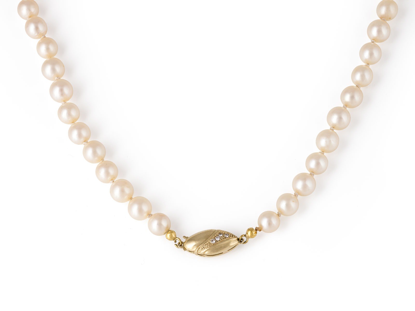GG 585. L.: ca. 45,0 cm. Ges.-Gew.: ca. 34,1 g. Perlen Collier. D.(Perle): ca. 7,5 mm.