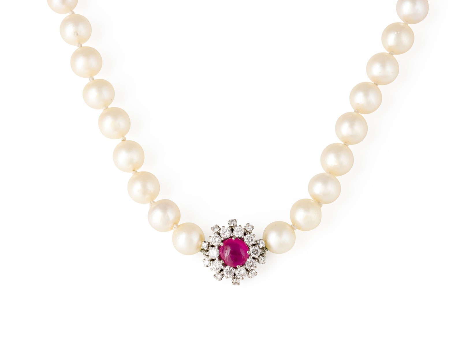 Verschluss, besetzt mit einem Rubin Cabochon von ca. 1.25 ct., sowie einem Kranz aus