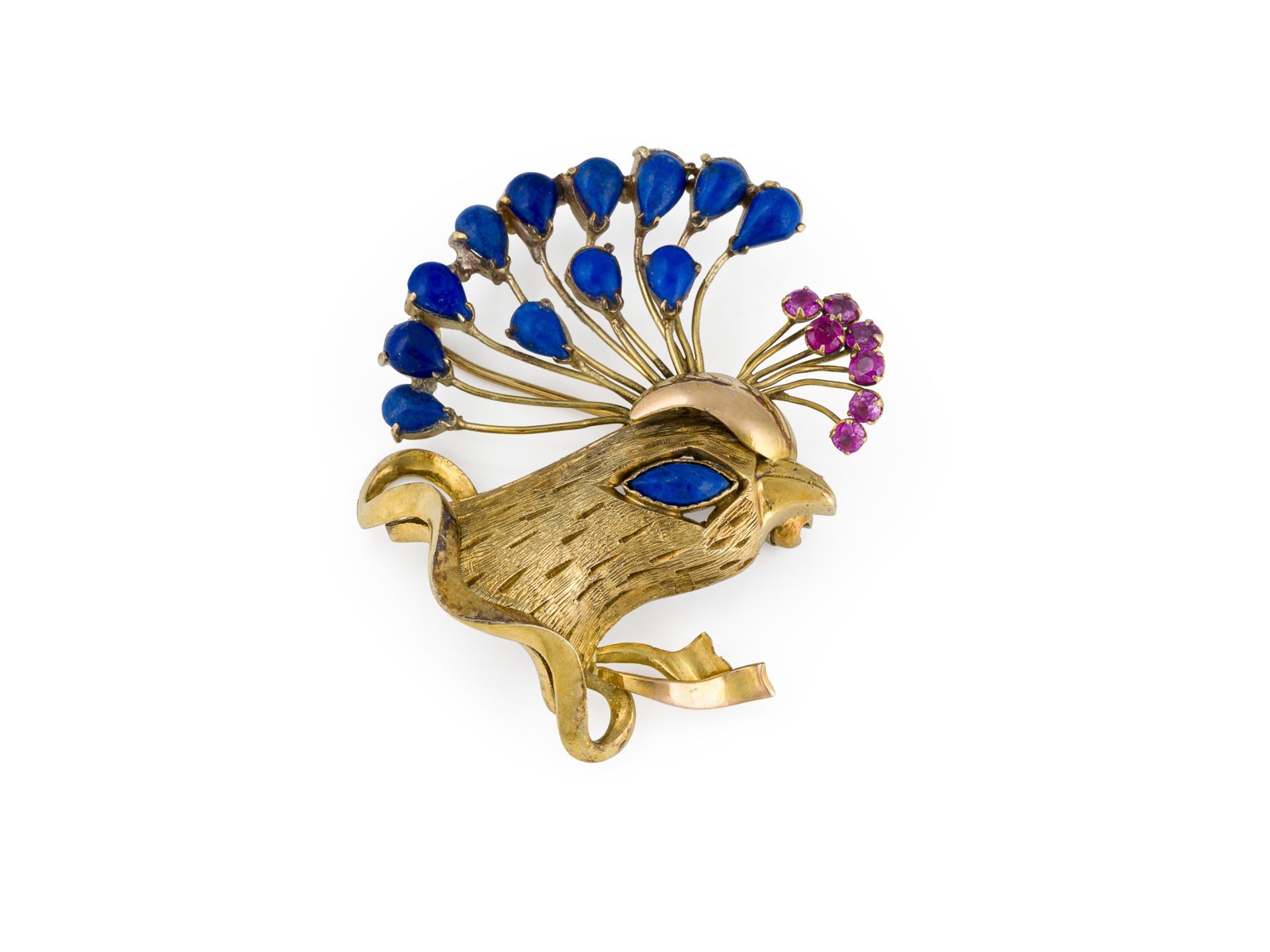 GG 585. Maße: ca. 32,7 x 41,0 mm. Ges.-Gew.: ca. 9,0 g. Brosche in Form eines Pfau-Kopfes, besetzt mit Lapis-Lazuli und pinken Farbsteinen.