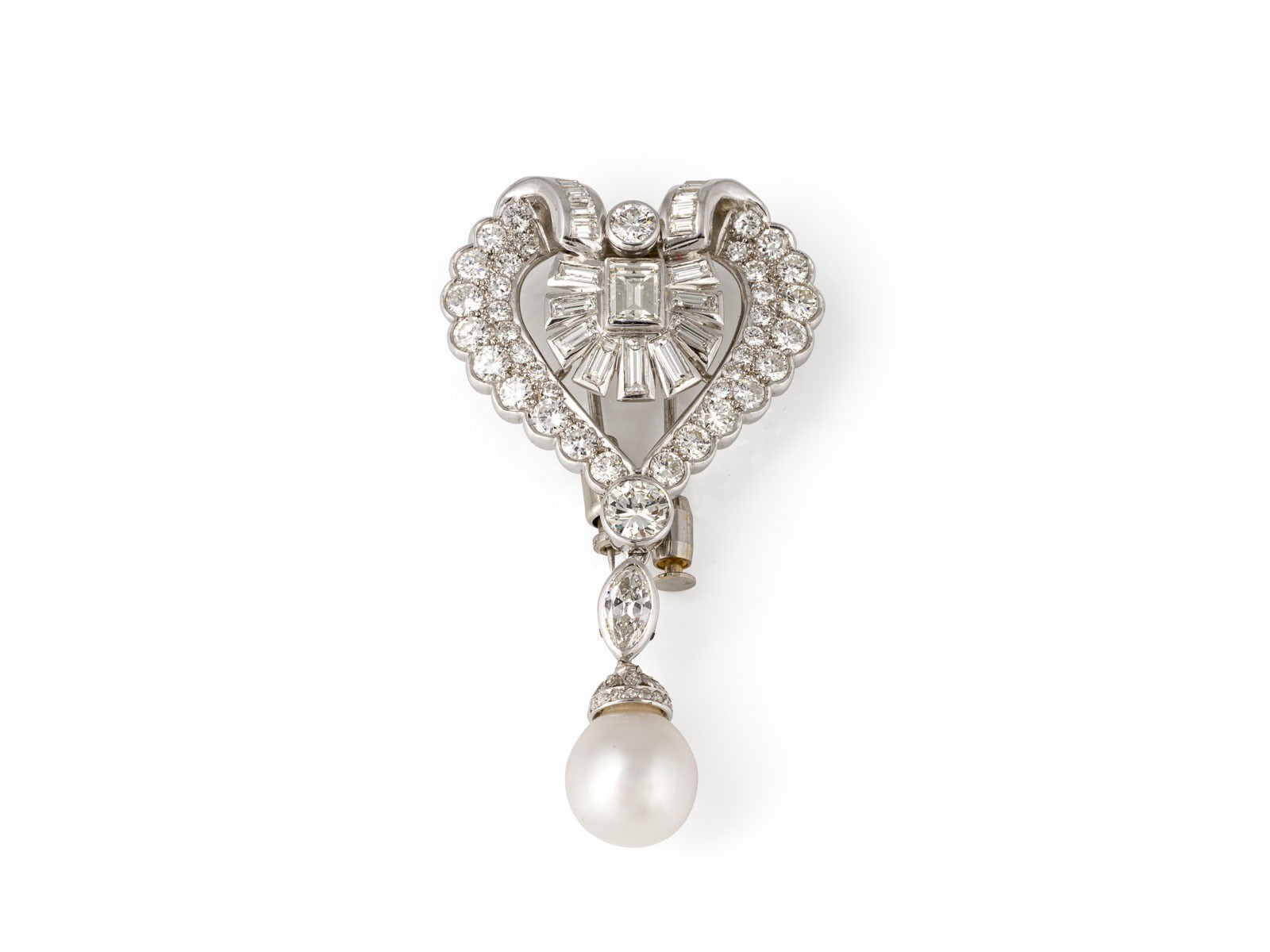 PT (getestet). Maße: ca. 60,3 mm x 33,5 mm. Ges.-Gew.: ca. 18,3 g. Prächtige Brosche, die auch als Anhänger getragen werden kann, üppig besetzt mit Diamanten