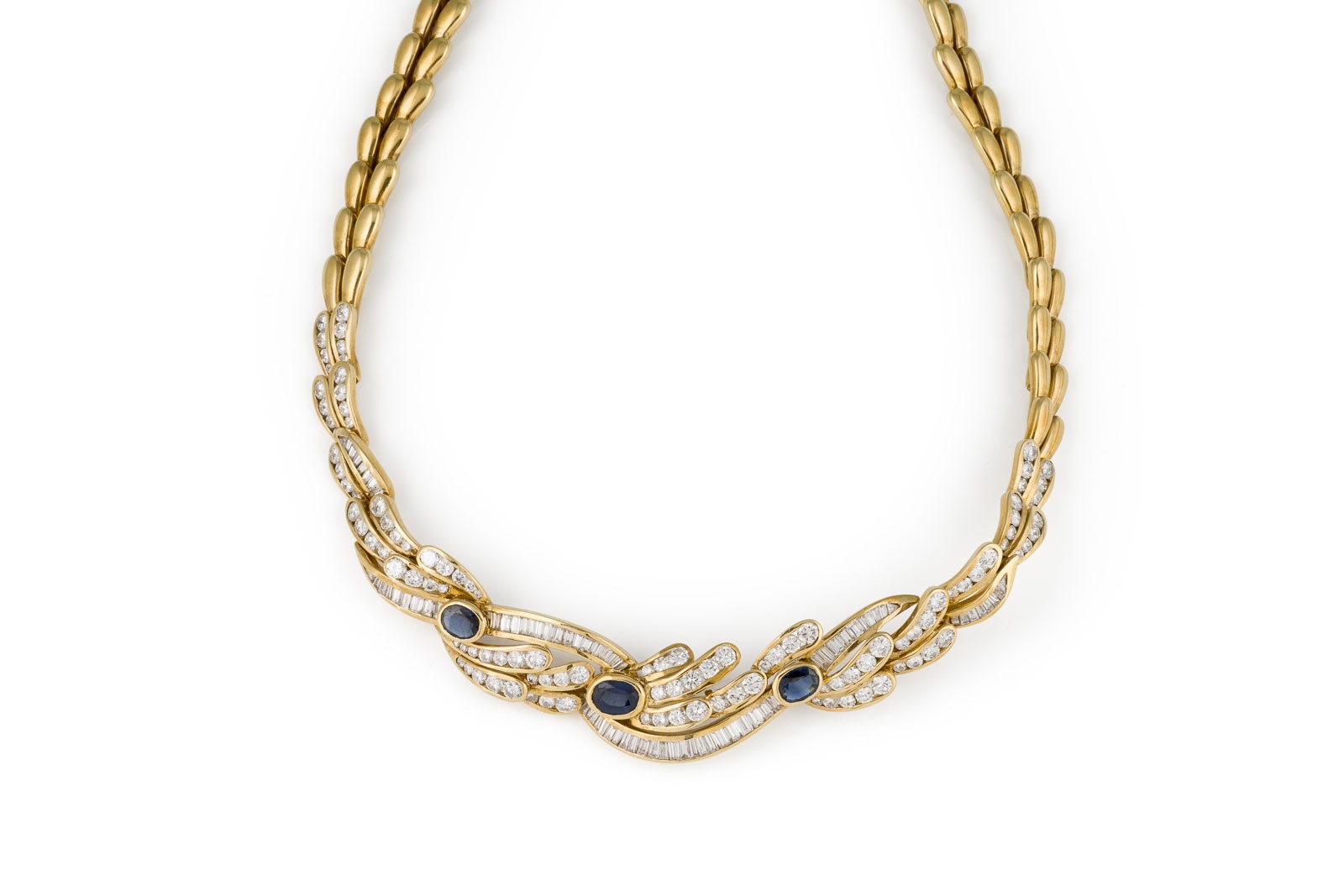 GG 750. L.: ca. 41,0 cm. Ges.-Gew.: ca. 86,8 g. Collier, besetzt mit drei Saphiren zus. ca. 3.27 ct., sowie etlichen Diamanten im