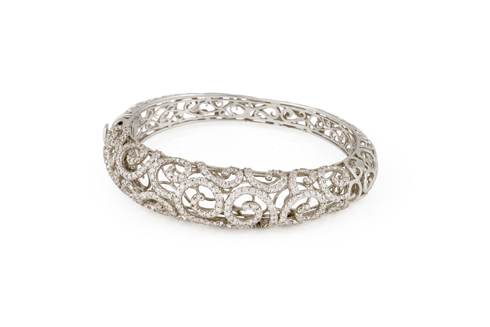 WG 585. D.(innen): ca. 68,0 mm. B.: ca. 18,1 mm. H.: ca. 1. Ges.-Gew.: ca. 43,0 g. Armreif, reichlich besetzt mit Brillanten zus. ca. 4.00-4.50 ct. Kastenschloss mit