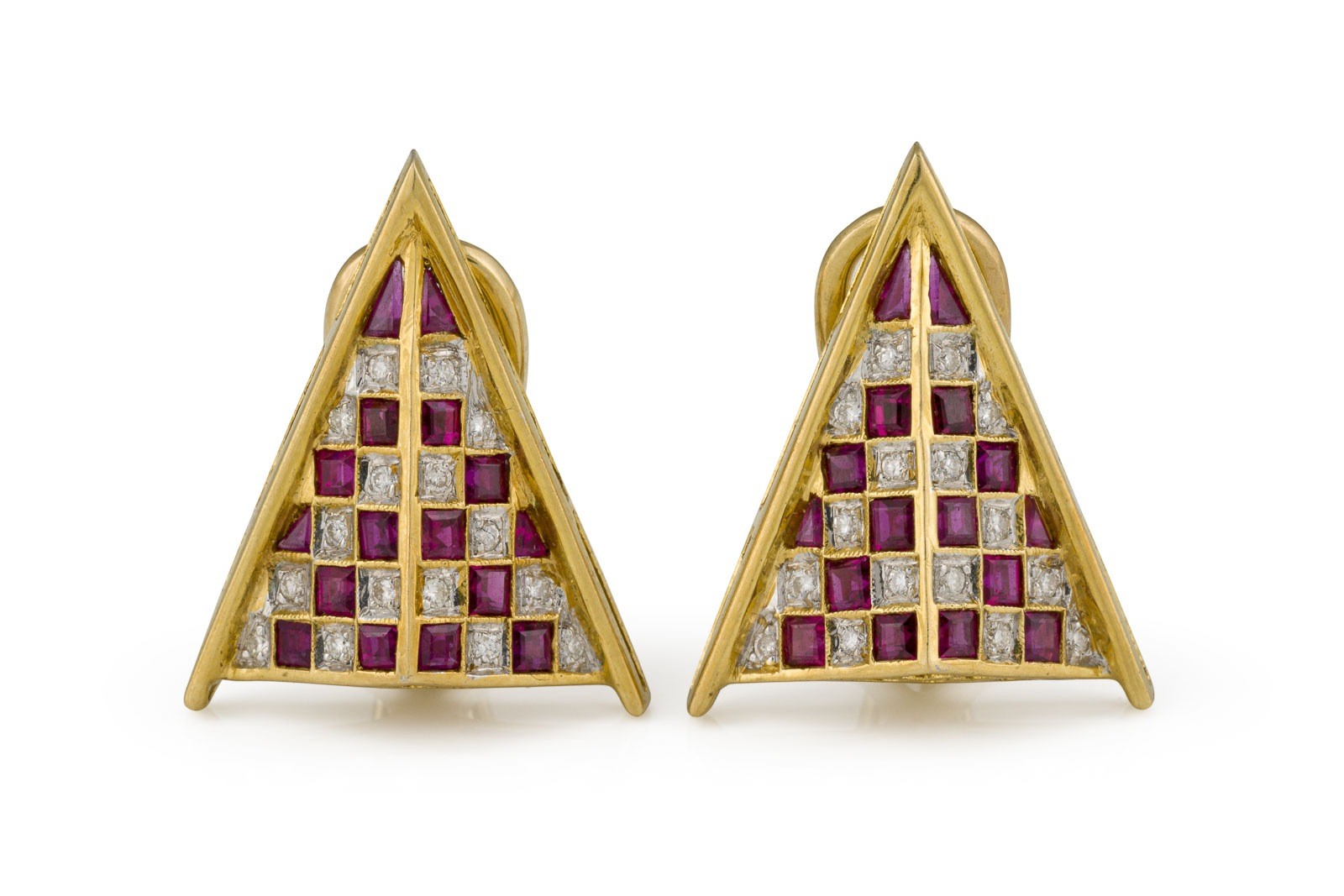 GG 750. Maße: ca. 22,3 x 18,1 mm. Ges.-Gew.: ca. 9,6 g. Pyramidenförmige Ohrclips mit einfaltbaren Steg, besetzt mit roten und weißen Steinen im