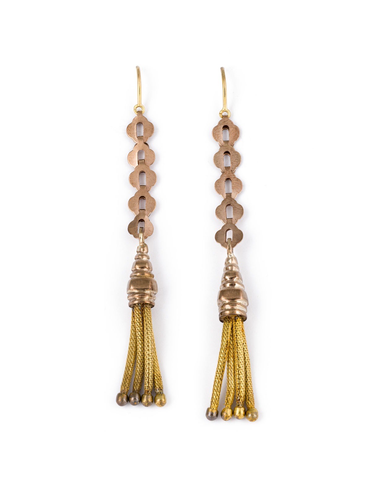 RG/GG 333 (getestet). L. ca. 69,0 mm. Ges.-Gew.: ca. 3,8 g. Lange Ohrhänger mit Quastenähnlichen Elemente an den Enden.