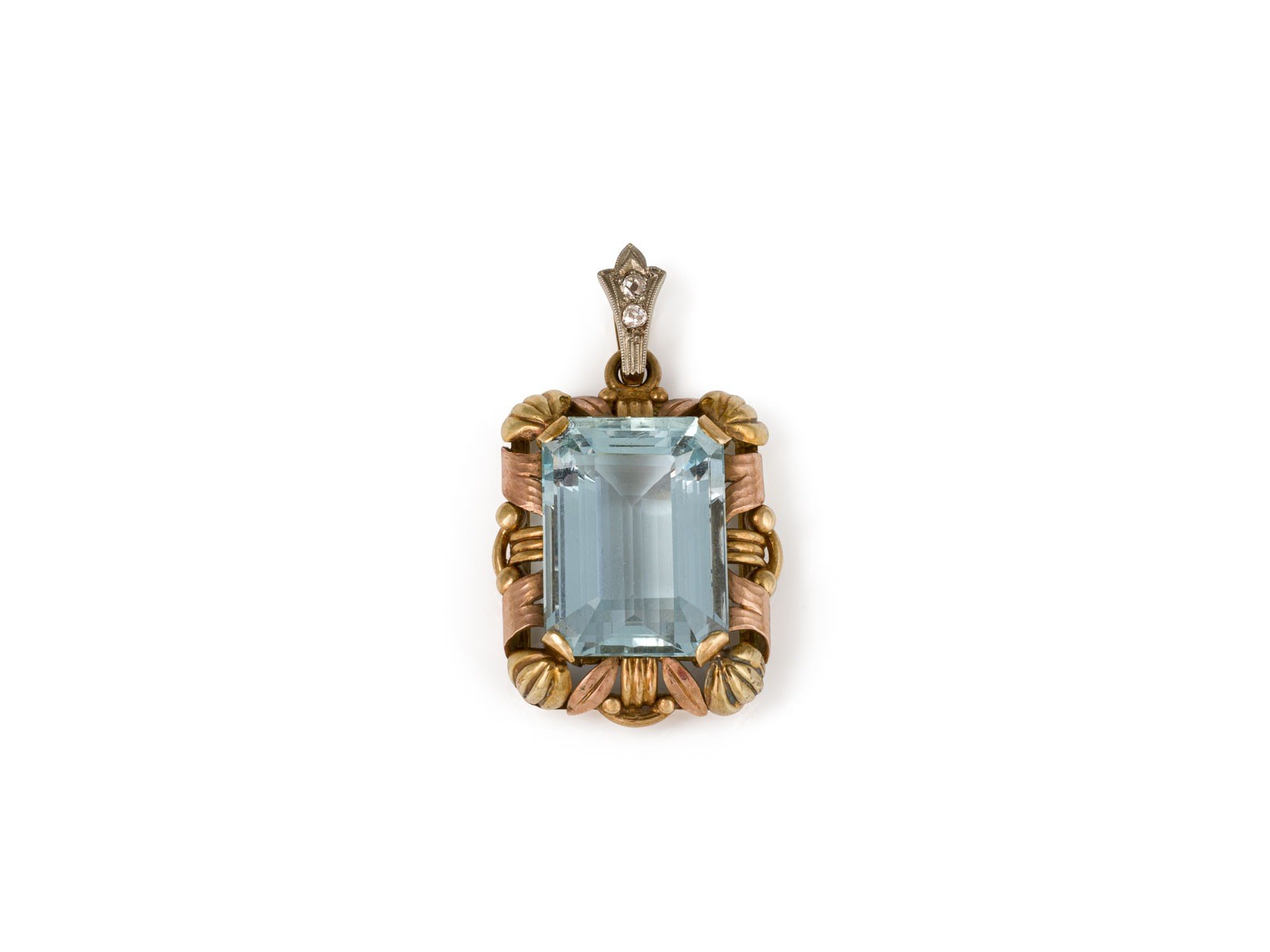 RECHTECKIGER AQUAMARIN ANHÄNGER Maße: L.(inkl. Öse): ca. 39,5 mm, B.: ca. 22,4 mm. Ges.-Gew.: ca. 9,3 g. Anhänger mit einem rechteckigen, facettierten Aquamarin von ca. 16.17 ct. in einer