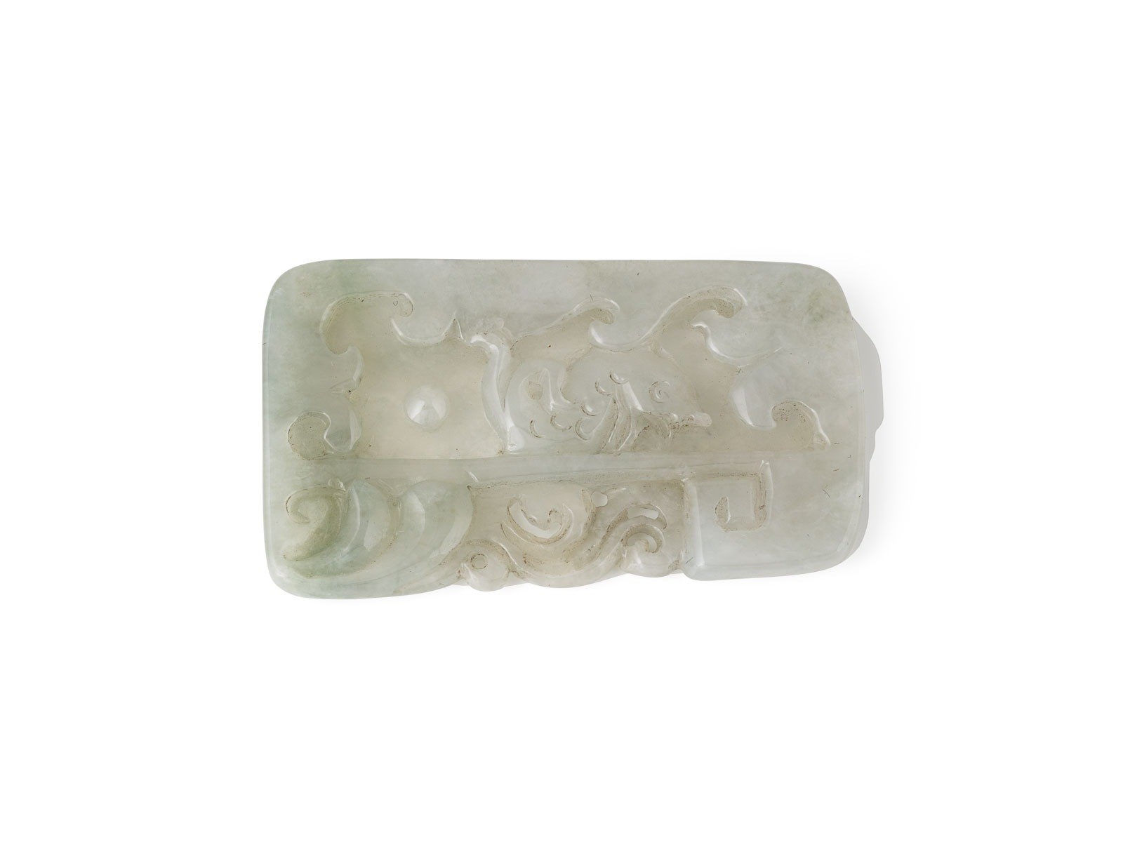 RECHTECKIGER GESCHNITZTER JADEIT ANHÄNGER Maße: ca. 53,7 mm x 32,3 mm. Ges.-Gew.: ca. 15,5 g. Geschnitzter Jadeit Anhänger.