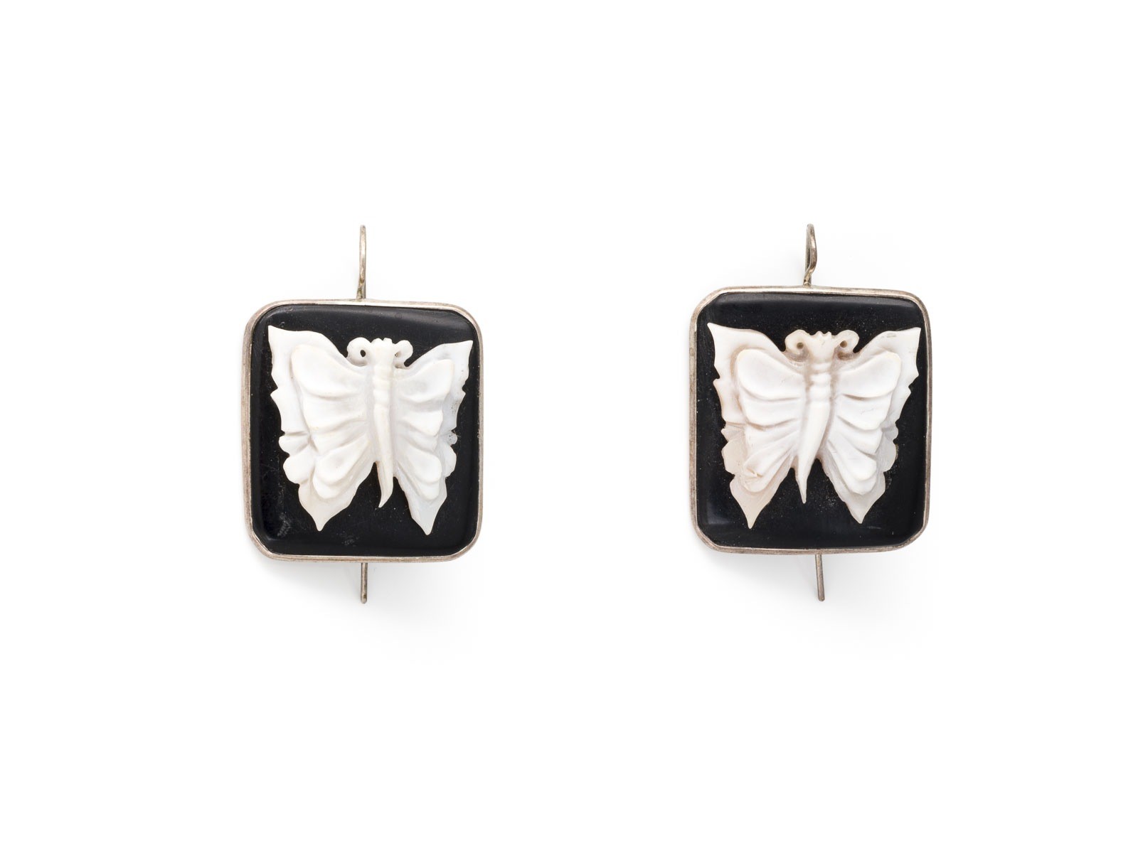 AG 925. Maße: L.: ca. 47,0 mm, B: ca. 34,5 mm. Ges.-Gew.: ca. 27,5 g. Sehr große, Ohrhänger mit einem geschnitzten Schmetterling aus Muschel auf einer wohl Onyx