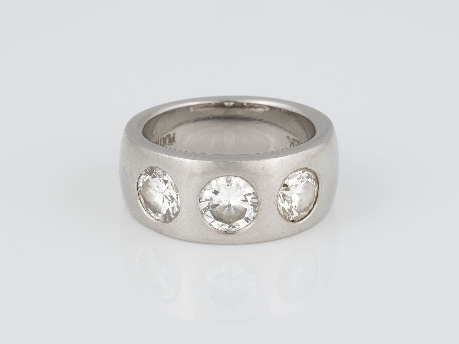 Platin. Ringmaß ca. 49,5, Ges.-Gew. ca. 16,4 g. Gest. Platin 950, Herstellersignet 'Hofacker'. Drei Brillanten, zusammen ca. 1,869 ct. 1 x ca. 0,583 ct., 1 x 0,616 ct., 1 x 0,67 ct.