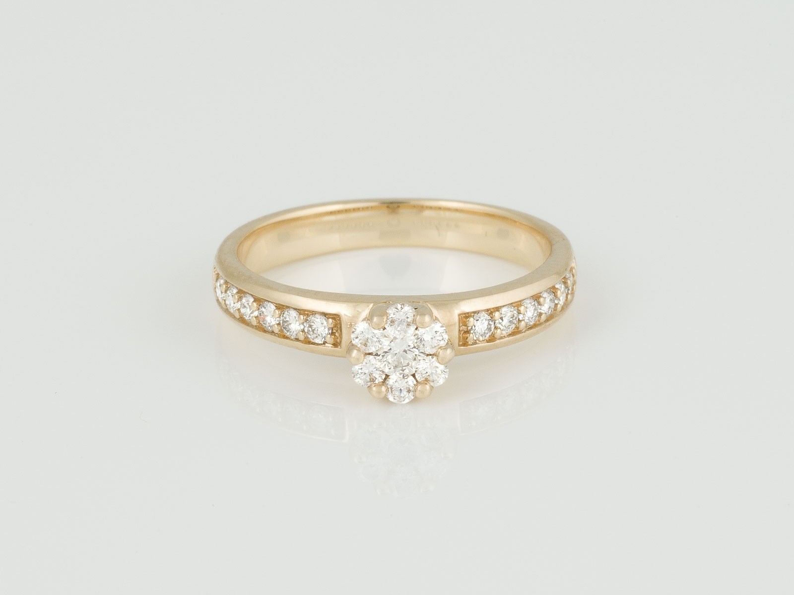 Gelbgold. Ringmaß ca. 48, Ges.-Gew. ca. 2,5 g. Gest. 585. 19 Brillanten, zusammen ca. 0,30 ct.