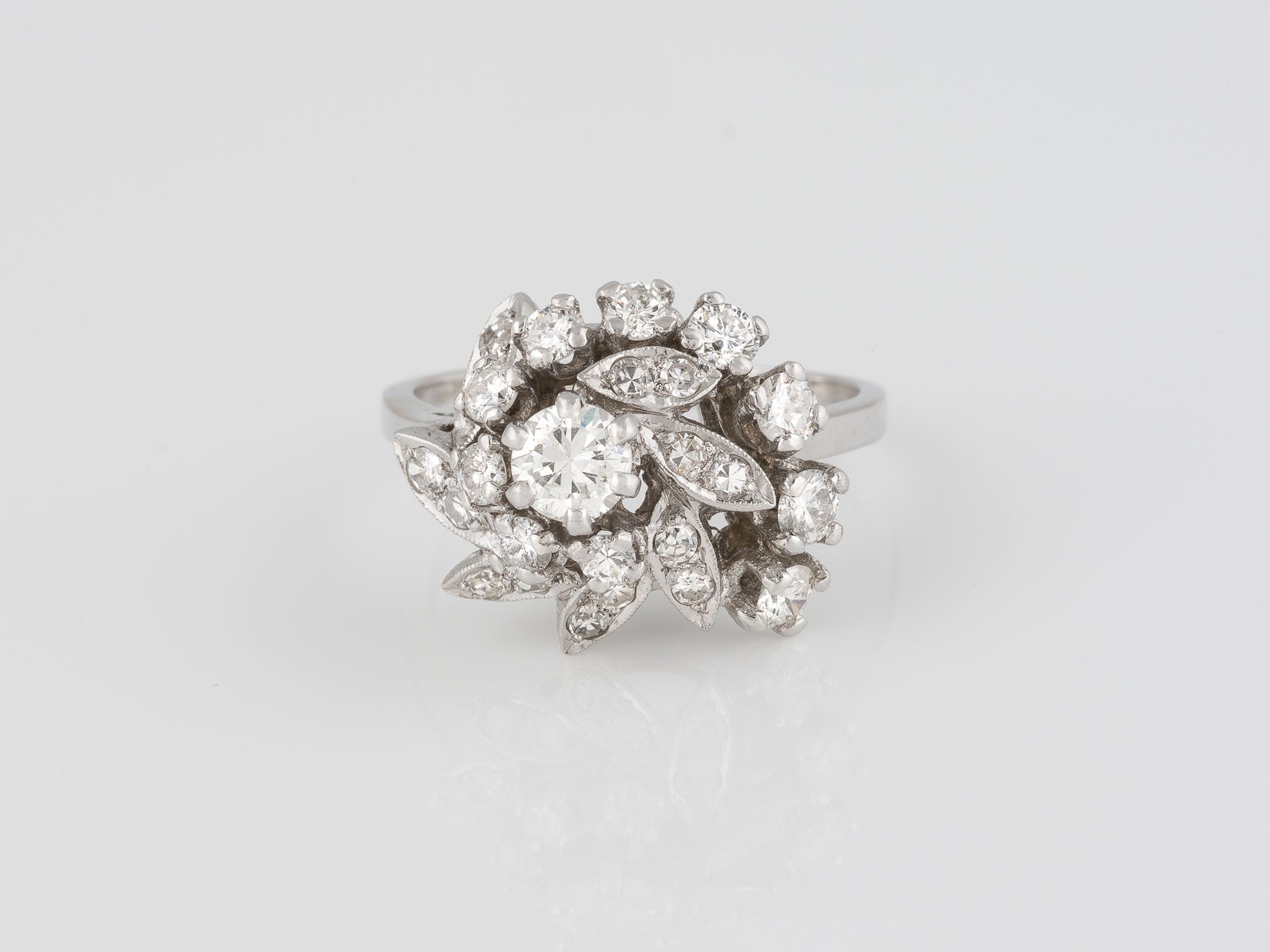 Weißgold. Ringmaß ca. 58, Ges.-Gew. ca. 5,5 g. Gest. 14 K, Herstellersignet. 15 Diamanten im Brillant- und 8/8-Schliff, zusammen ca. 1,30 ct. Part. leicht besch.