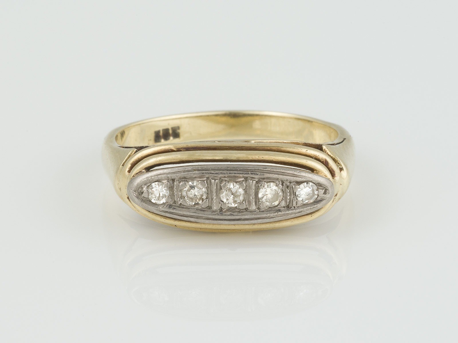 Gelbgold, wohl Platin. Ringmaß ca. 55, Ges.-Gew. ca. 3,7 g. Gest. 585. Fünf Diamanten im 8/8-Schliff, zusammen ca. 0,12 ct.
