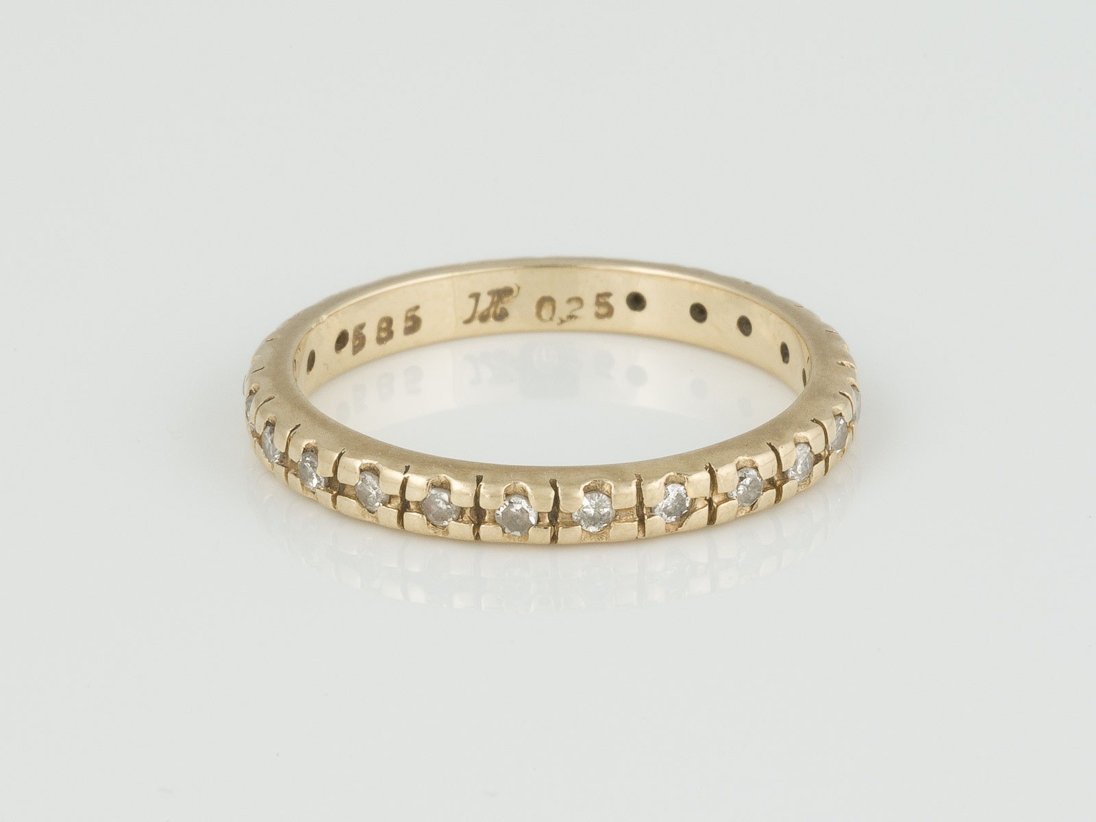 Gelbgold. Ringmaß ca. 53, Ges.-Gew. ca. 2,2 g. Gest. 585, Herstellersignet, Caratangabe der Diamanten gemarkt. Eternity-Ring, 24 Diamanten zusammen ca. 0,25 ct. Tragespuren.