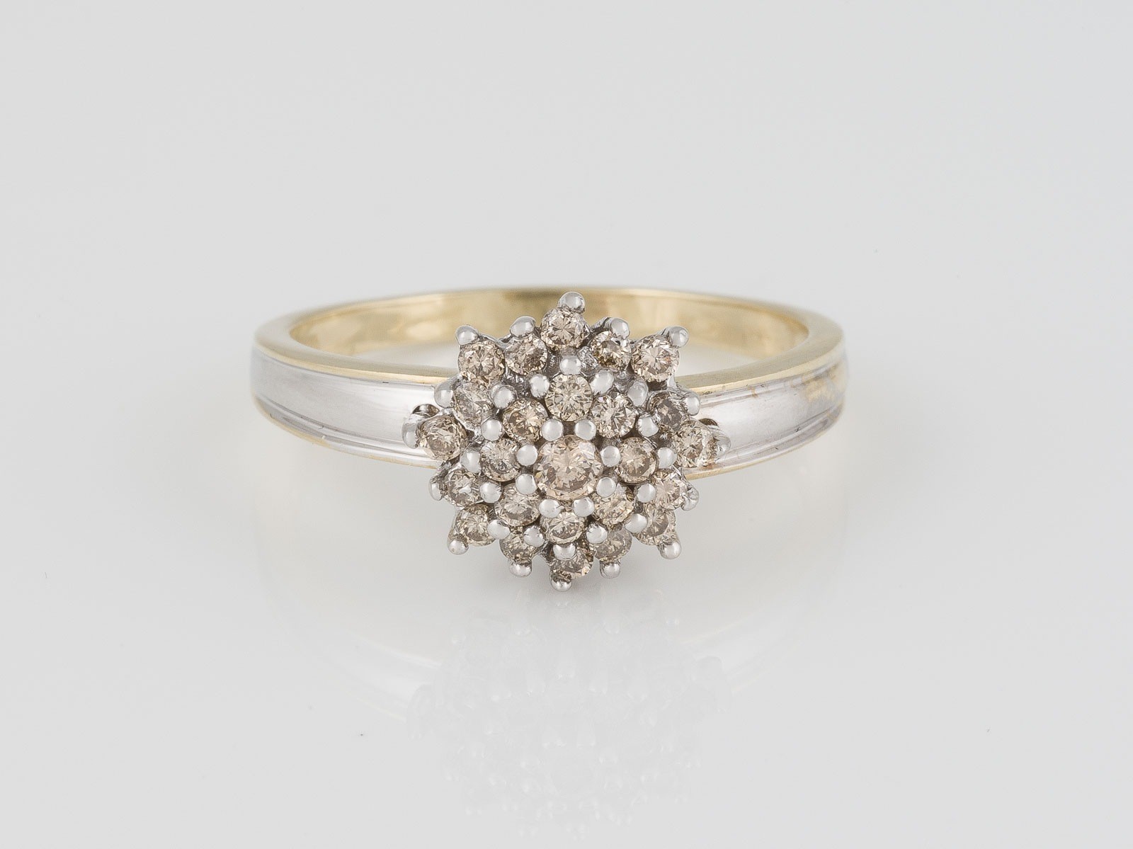 Gelbgold, Weißgold. Ringmaß ca. 58, Ges.-Gew. ca. 3,2 g. Gest. 14 K. 25 Brillanten, zusammen ca. 0,28 ct. Minimalste Tragespuren.