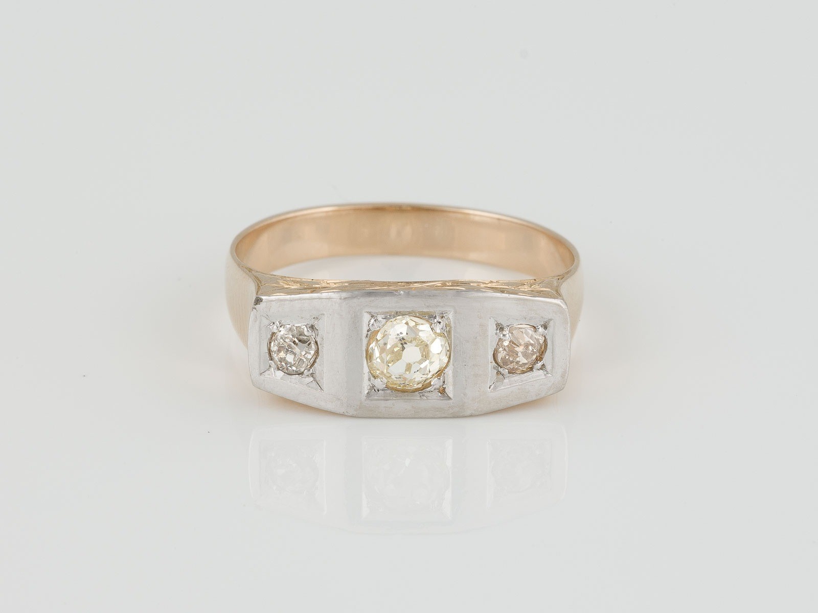 Gelbgold, Platin. Ringmaß ca. 57, Ges.-Gew. ca. 5,6 g. Gest. 585, Pt. Drei Diamanten im Altschliff, zusammen ca. 0,40 ct.