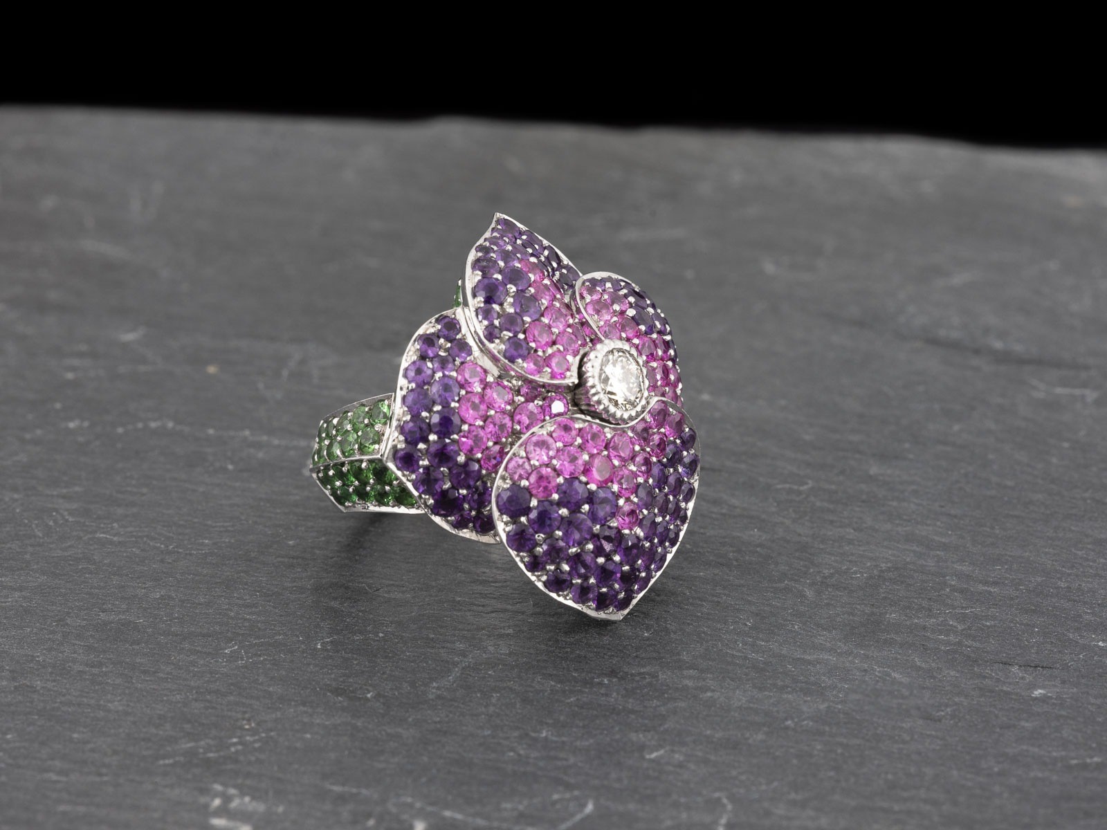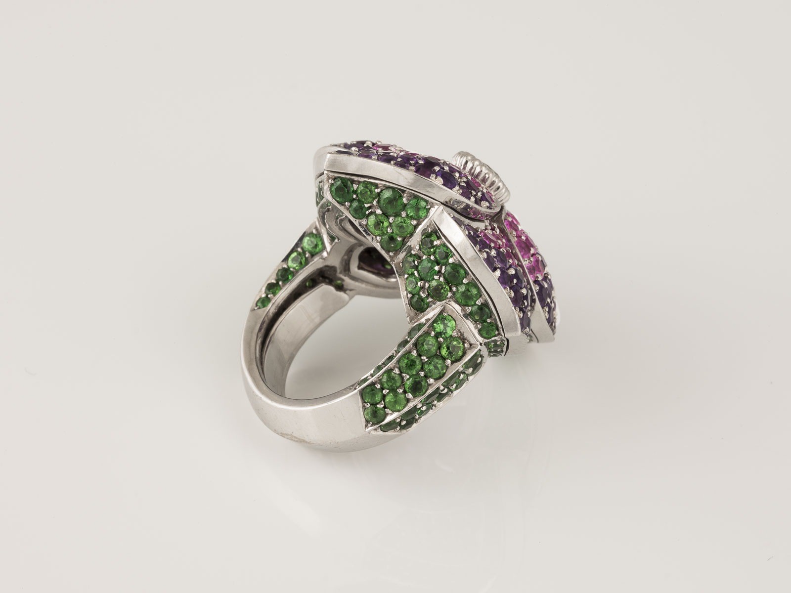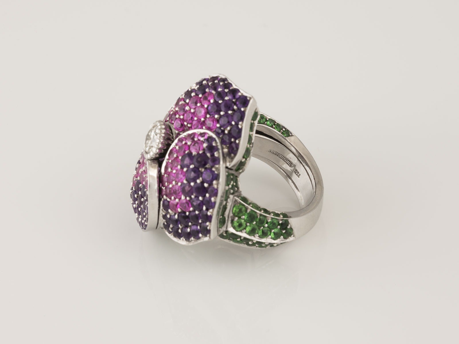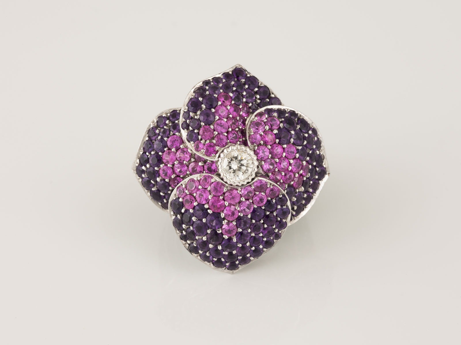 rund facettierte Amethyste, 54 rund facettierte Pink Saphire/Rubine. Part. besch. Flexibles Schienenelement zur Größenregulierung eingesetzt.