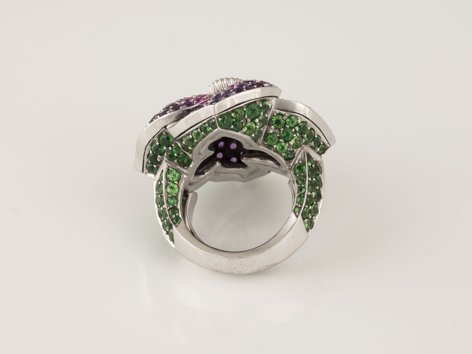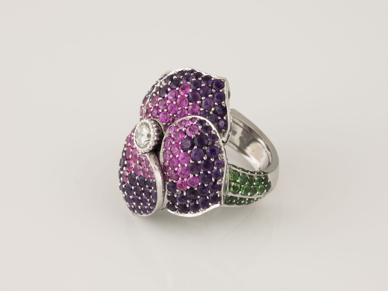 Weißgold. Ringmaß ca. 54,5, Ges.-Gew. ca. 38,6 g. Gest. 750, Herstellersignet 'Hornemann'. L. Kopf ca. 3,5 cm. Ein Brillant, ca. 0,40 ct., ca. 120 rund facettierte Tsavorite, ca. 95