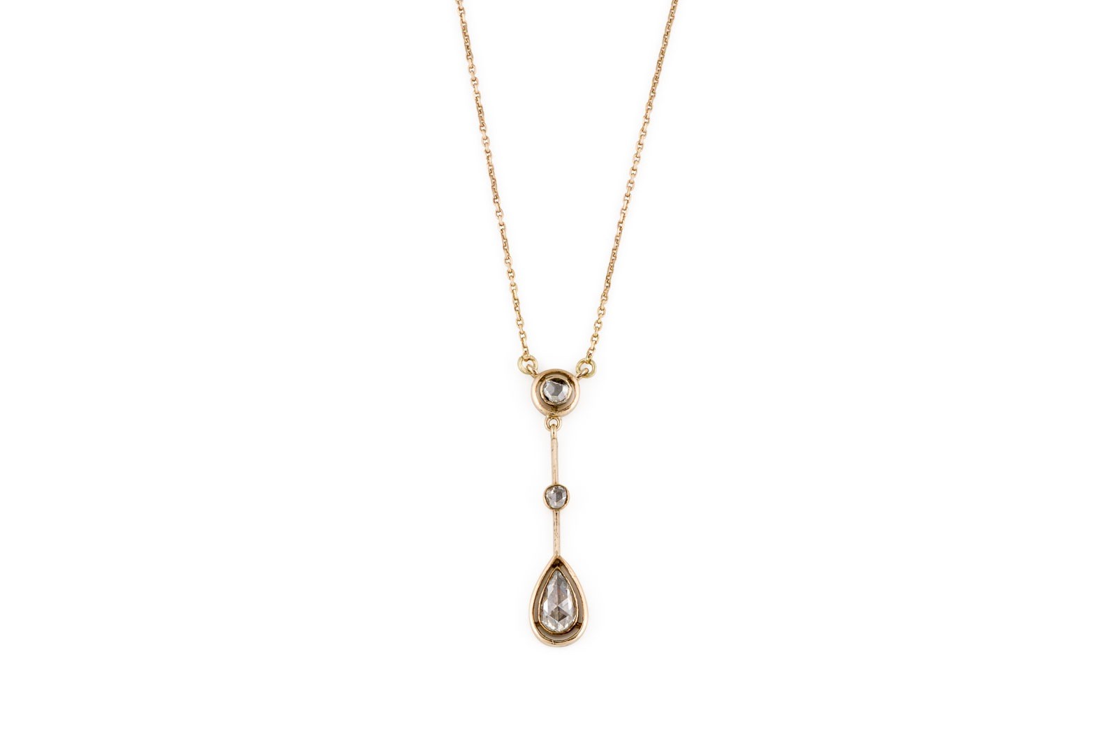 GG 585. L.(Collier): ca. 45,0 cm.. Ges.-Gew.: ca. 3,1 g. Collier, besetzt mit Diamanten im Rosenschliff zus. ca. 0.60 ct. Karabinerverschluss.